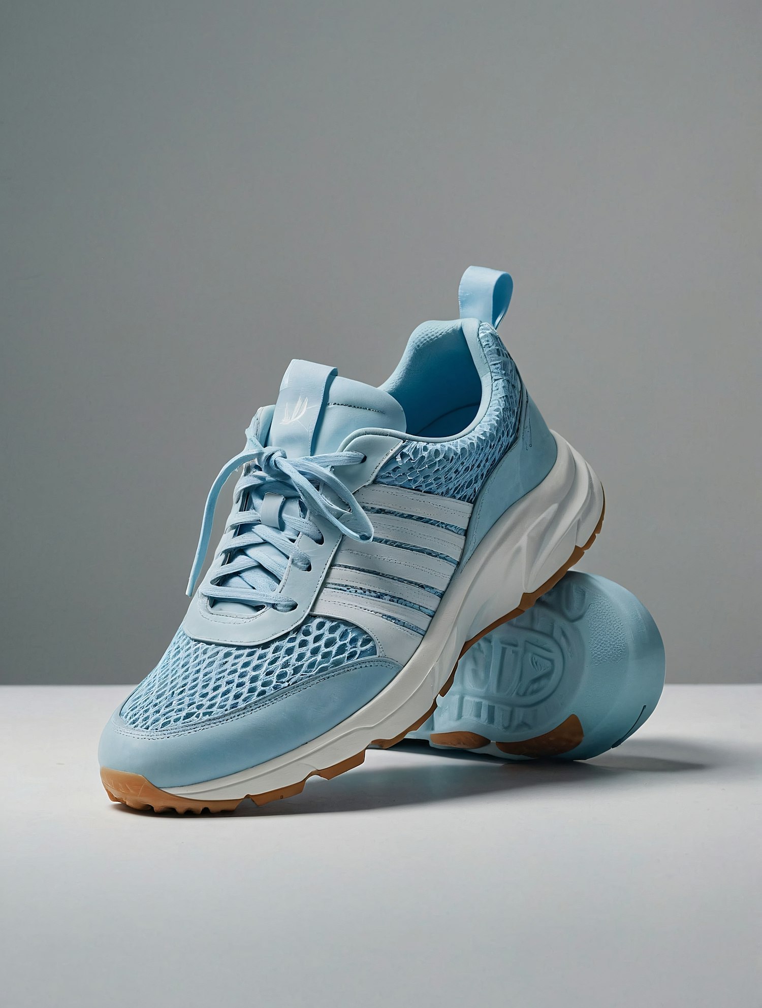 Light blue sneakers with mesh and leather details, white midsole, and gum outsole. Perfect blend of style and comfort for everyday wear.