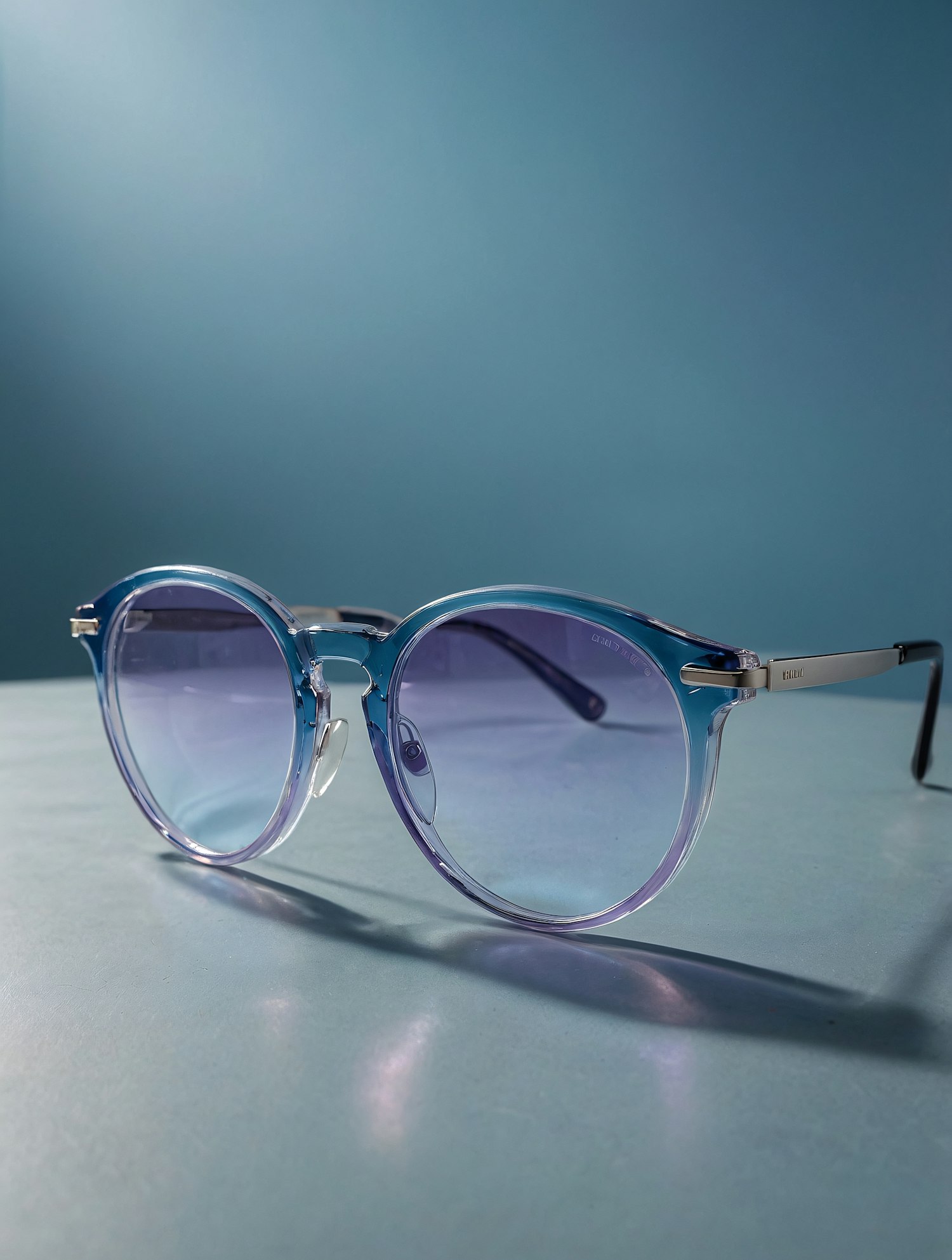 Trendy round sunglasses with blue gradient lenses and a transparent blue frame, set against a teal background for a modern vibe.