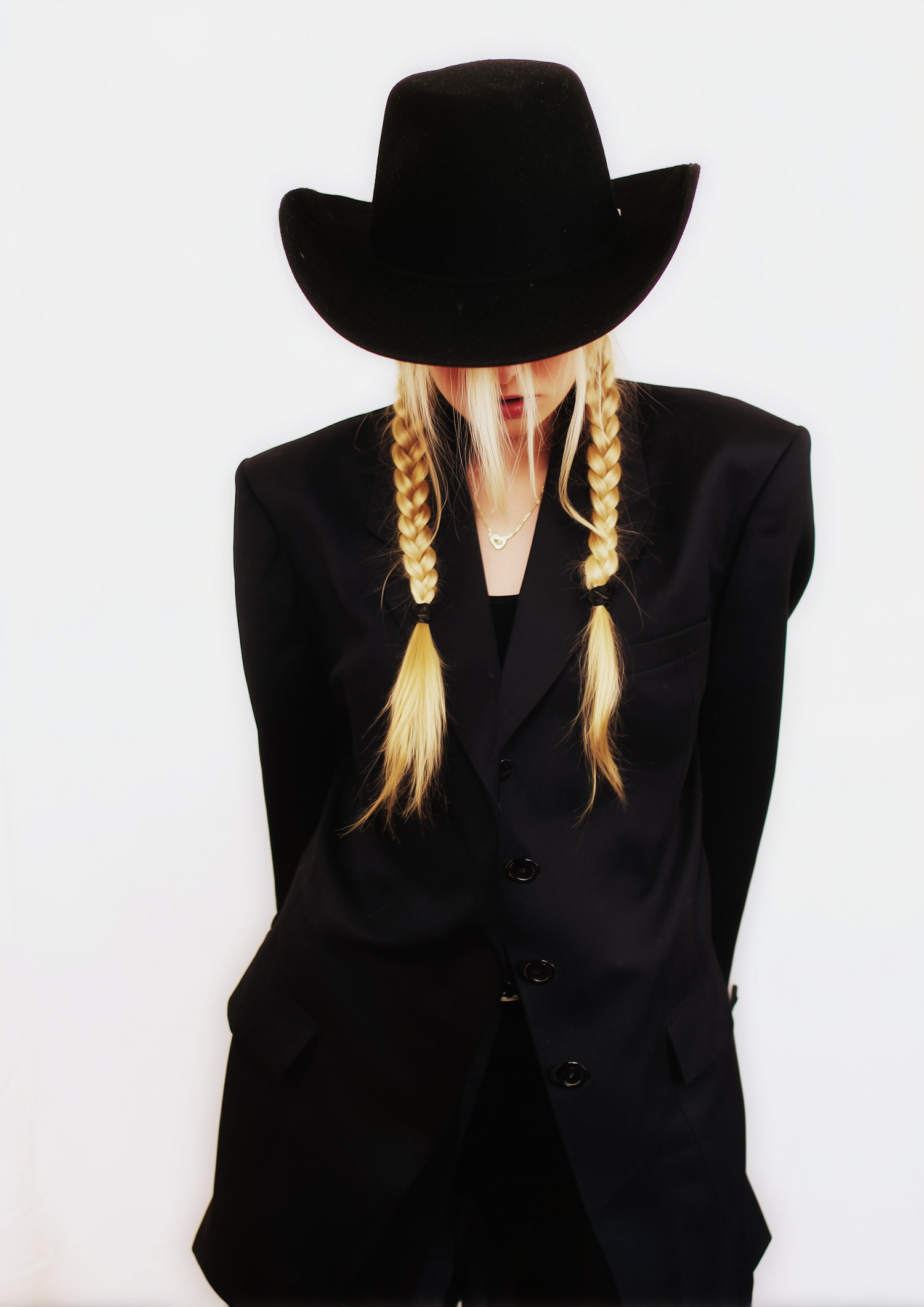 A stylish individual in a black suit and hat with braided hair, set against a white background, creating a striking contrast.