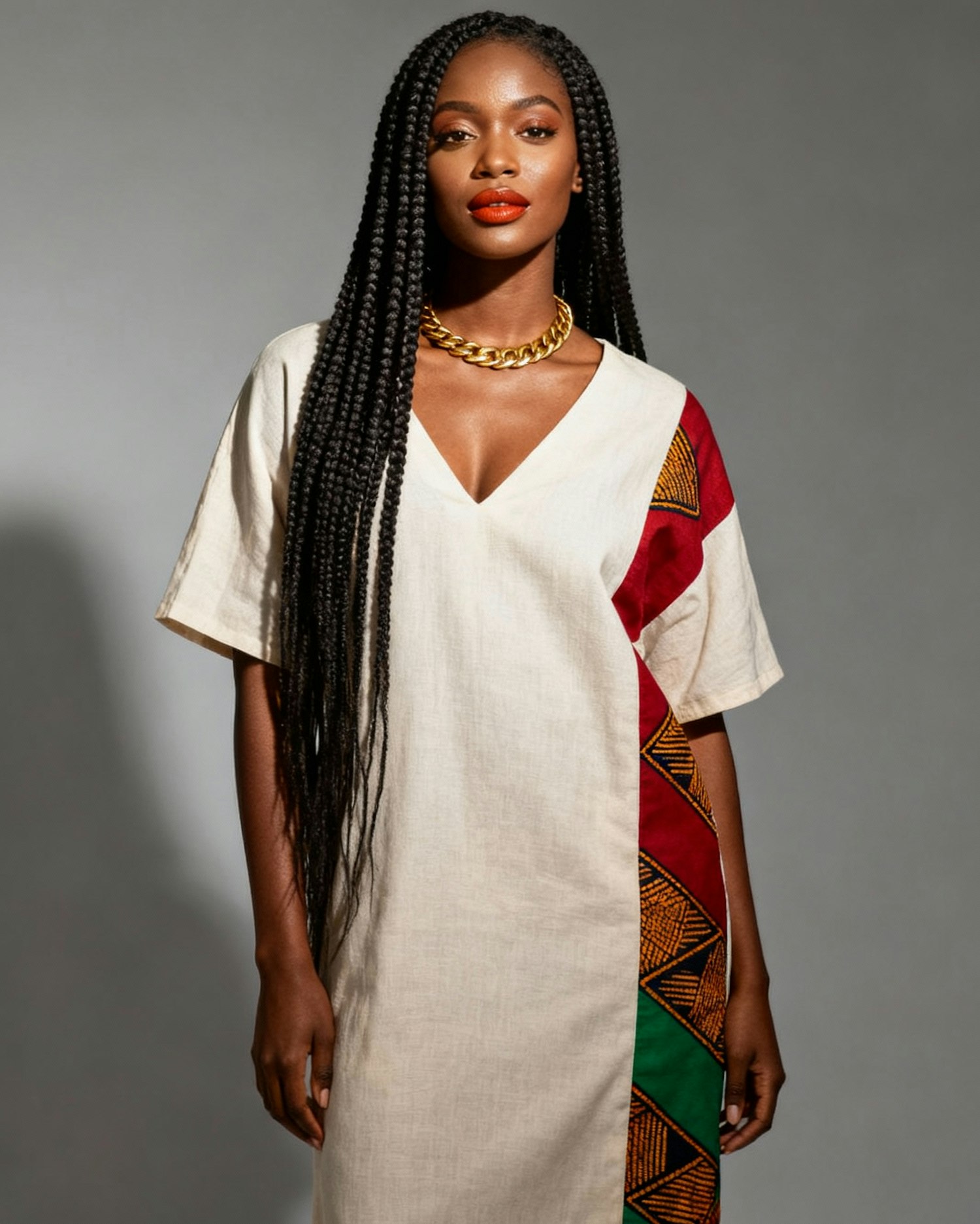 Full-body, high-definition portrait of a woman with glowing skin, box braids, and warm-toned makeup, wearing a gold necklace with a loose-fitting dress with a bold geometric panel in 3 complementary colors along one side. The dress features a V-neck and short sleeves, blending traditional textile motifs with a modern silhouette. She stands confidently with a composed expression. The neutral gray background enhances the tones of her outfit, highlighting the layered textures. Lighting is soft and directional, casting subtle highlights across her skin and garment. The overall mood is modern, modest, and editorially sharp—ideal for a Gen Z fashion portrait or Afro-fusion identity showcase.