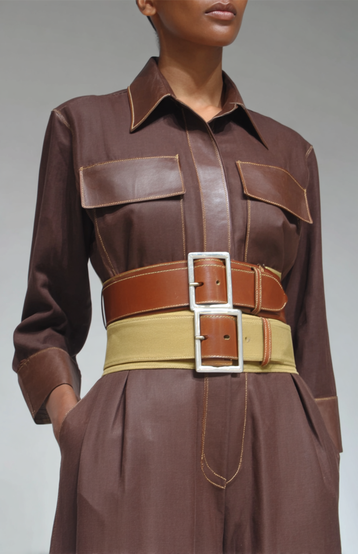 A stylish brown jumpsuit with a dual-buckle belt, blending utility and fashion in a neutral setting.