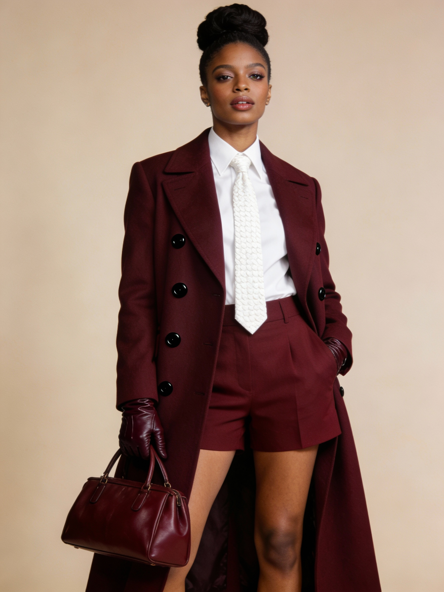 A hyperrealistic editorial fashion image of a stylish Afro-Fusion woman standing in front of a plain beige background. She wears a deep burgundy long coat with black buttons over a crisp white dress shirt and a textured white tie. Her burgundy shorts add a bold, fashion-forward twist. Accessories include a matching structured burgundy handbag, burgundy gloves, and an elegant updo hairstyle. The background is soft and neutral, complementing her skin tone and outfit. Lighting is cinematic and diffused, emphasizing textures, tailoring, and emotional storytelling. The mood is regal, confident, and culturally expressive.