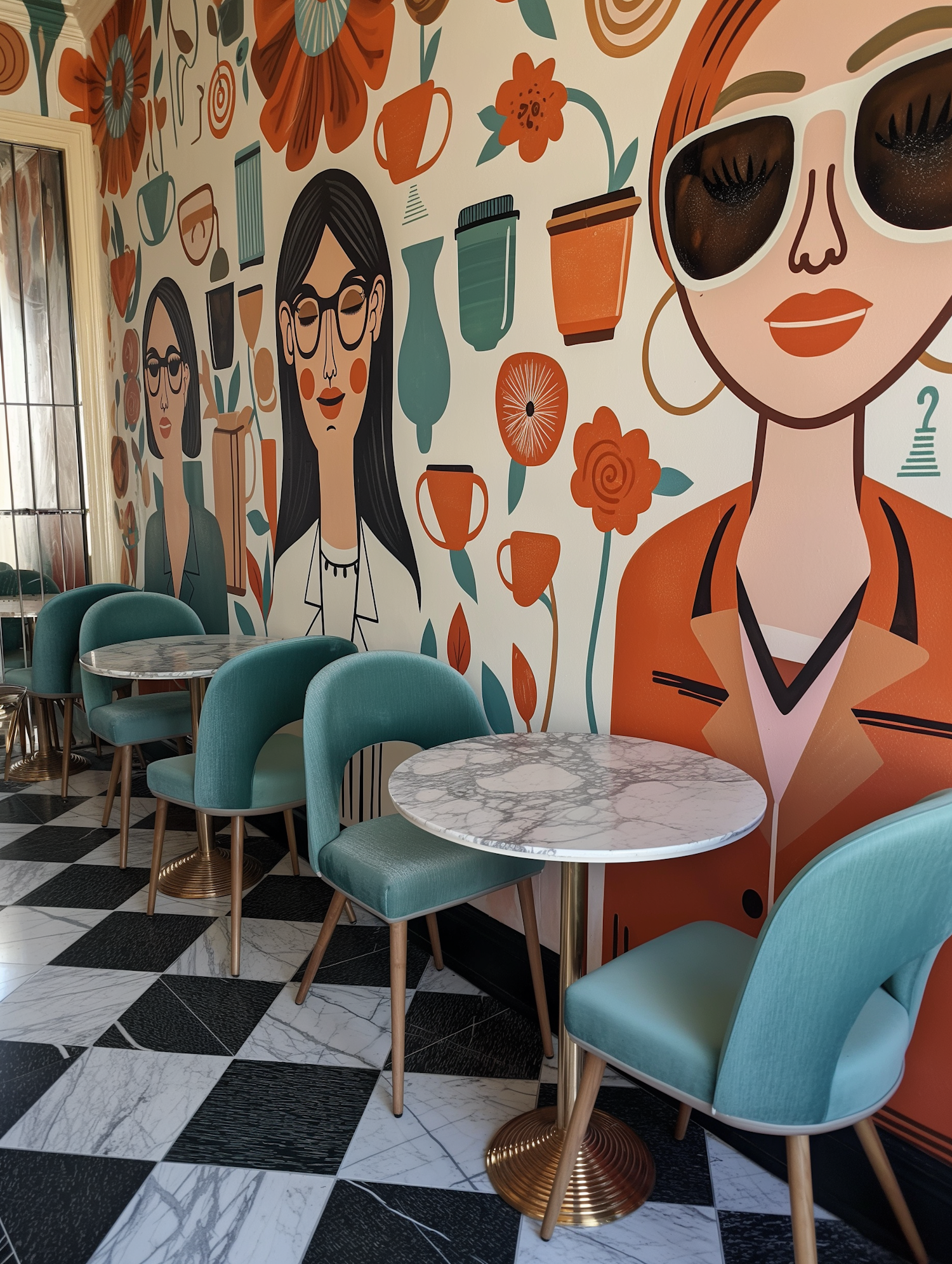 Chic café interior with vibrant mural, marble tables, and teal chairs. Bold colors and patterns create a lively, modern atmosphere.