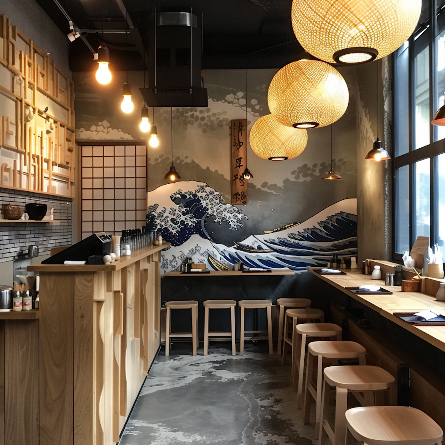 Cozy Japanese restaurant interior with Great Wave mural, wooden stools, and warm lighting from hanging lanterns.