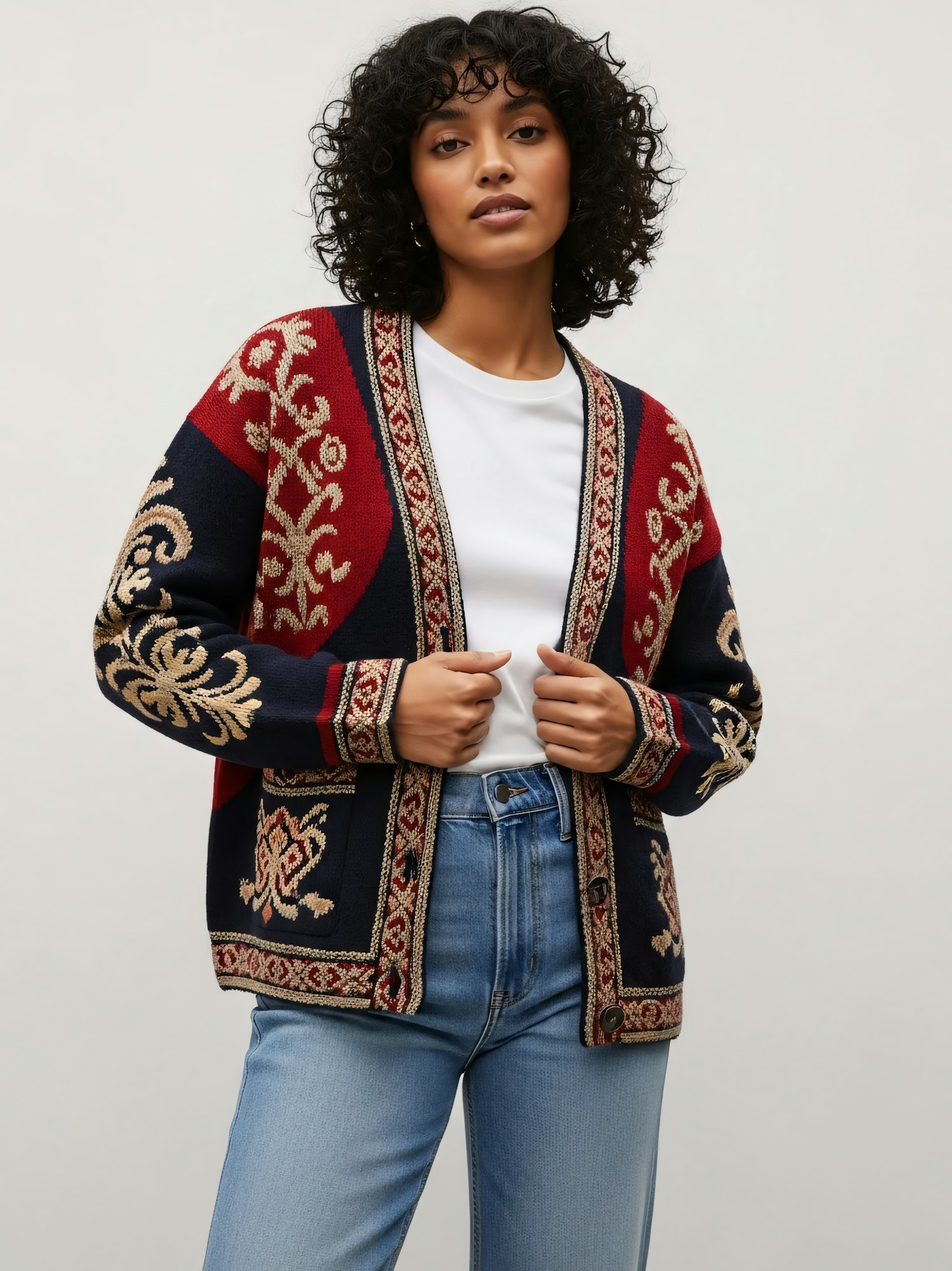 Stylish individual wearing a patterned cardigan with intricate designs, paired with a white shirt and light blue jeans against a neutral background.