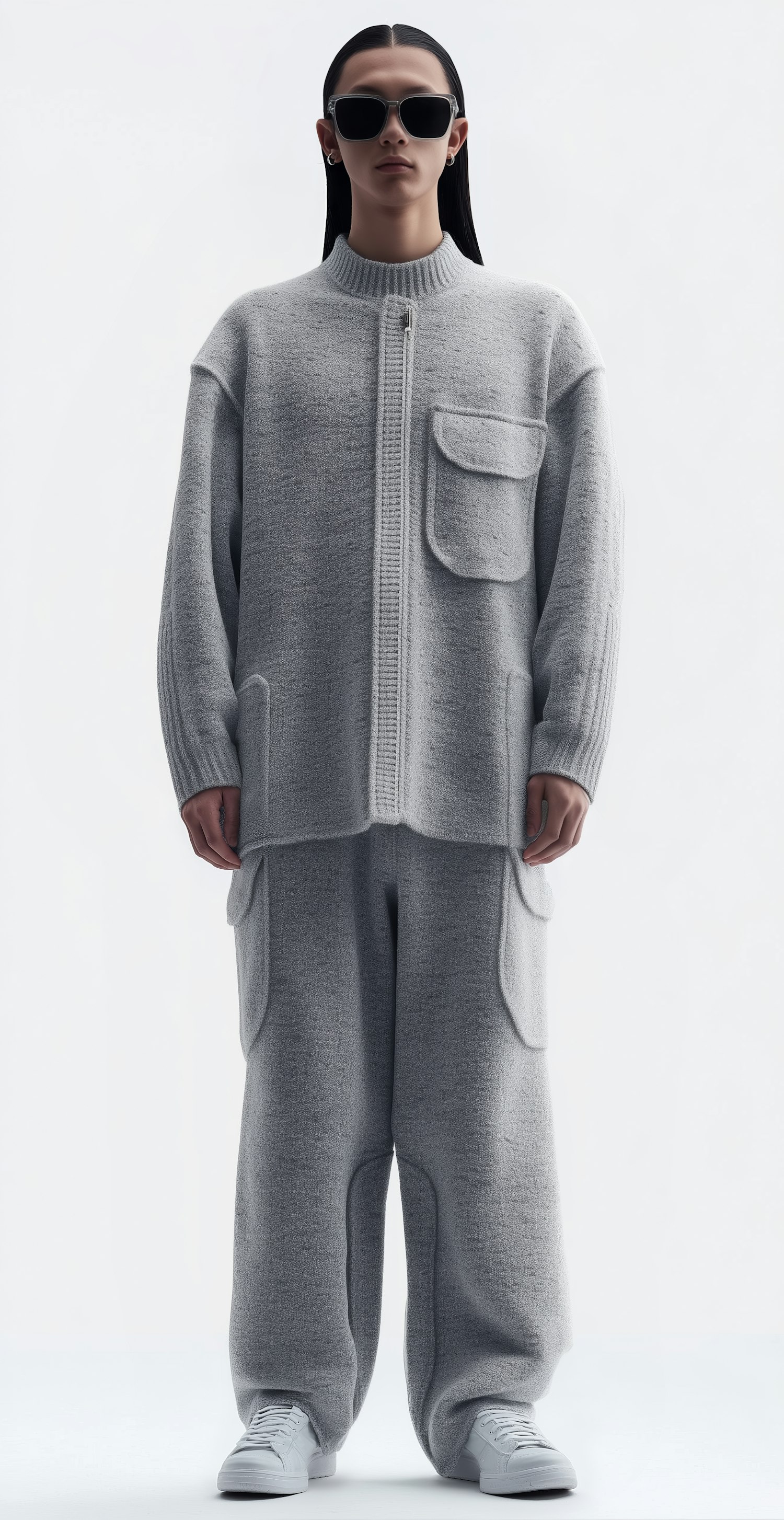 A person in a gray knit outfit with sunglasses and white sneakers, showcasing a modern and minimalist fashion style.