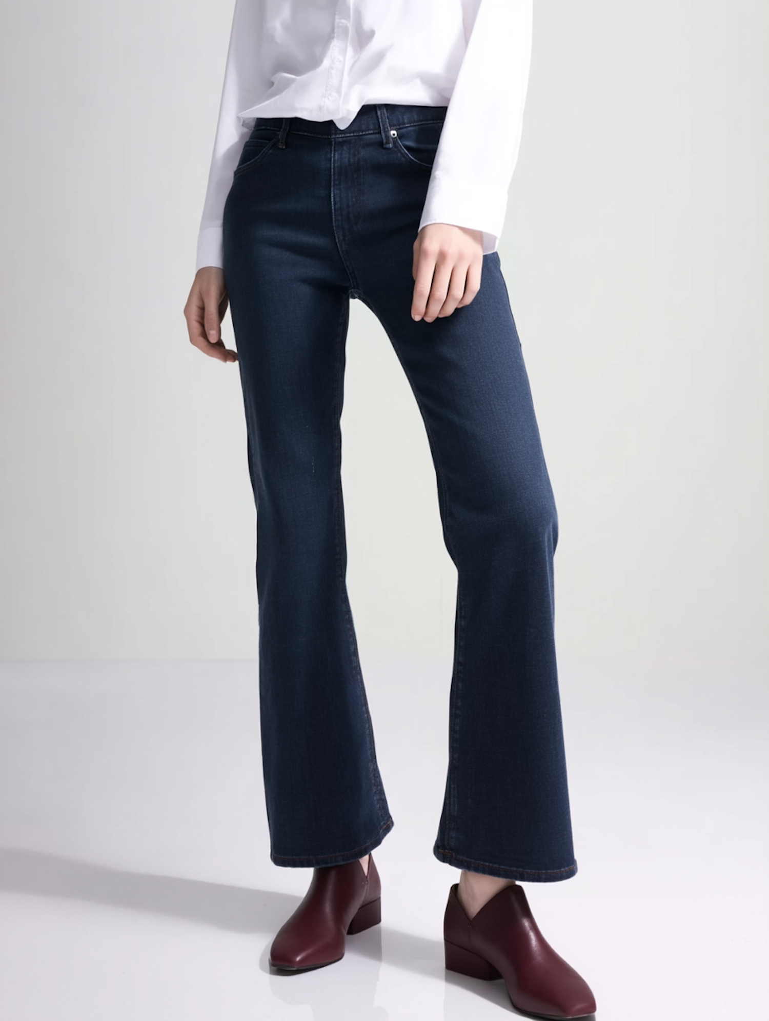 Dark blue flared jeans styled with a white button-up shirt and burgundy ankle boots, perfect for a chic and casual look.