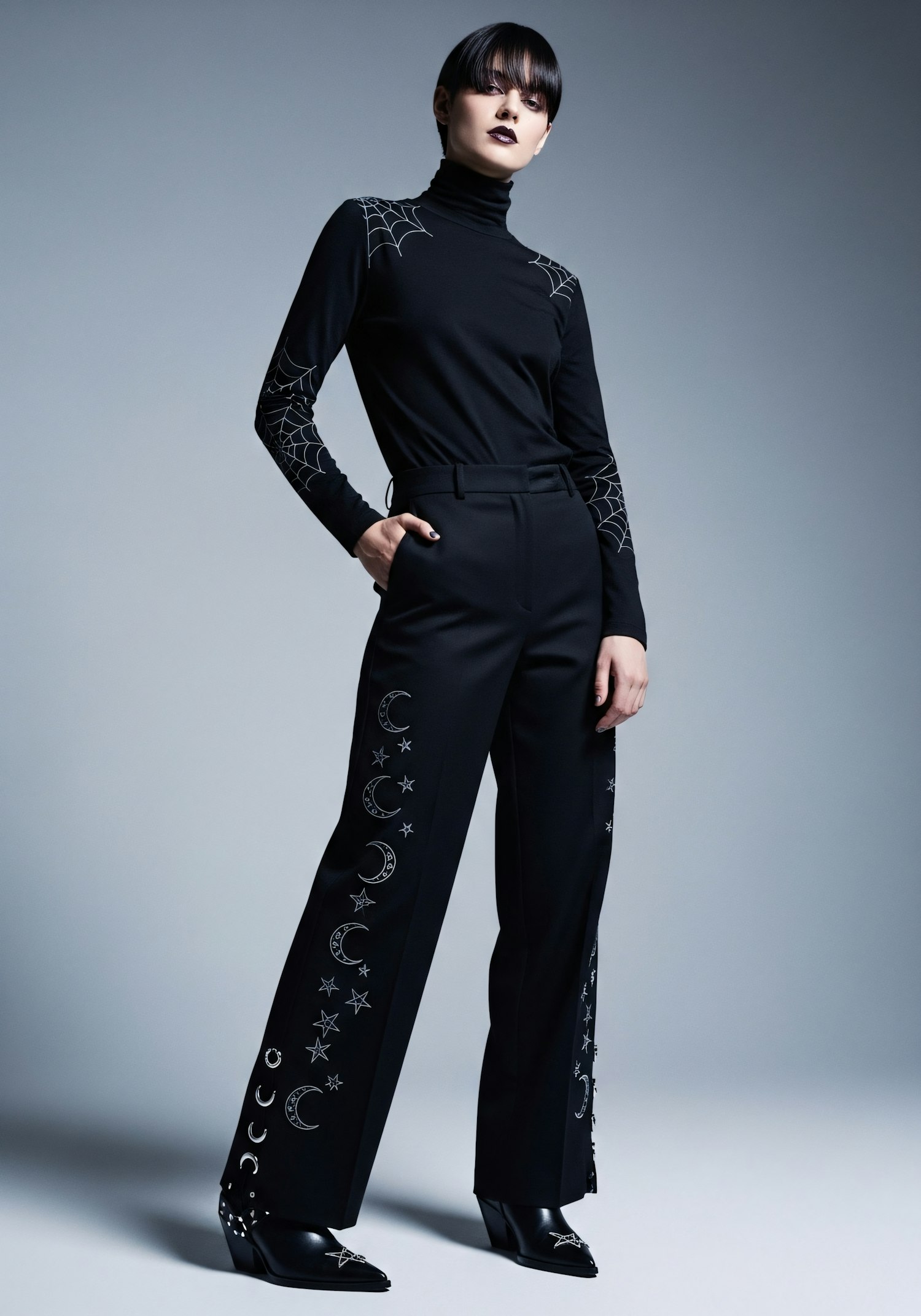 A stylish individual in a black outfit with celestial and spiderweb designs, paired with sleek black shoes, against a cool-toned background.