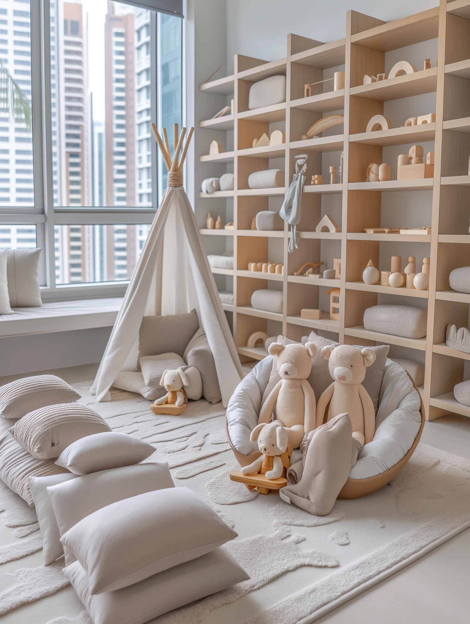 Modern children's playroom with neutral tones, wooden toys, a teepee tent, plush cushions, and large windows with city views.