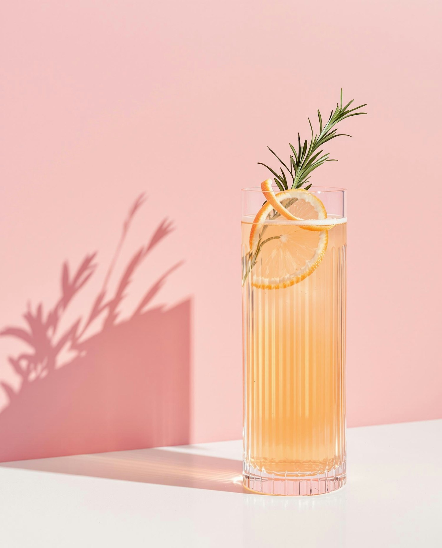 A tall ribbed glass filled with a peach-colored cocktail, garnished with a rosemary sprig and grapefruit peel. Minimalist setting with a clean white surface and a solid pink background. Strong shadows and editorial lighting