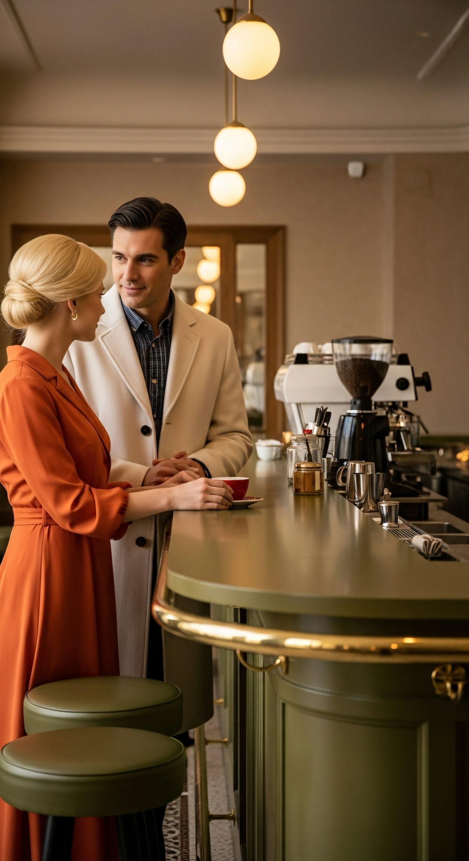 A stylish couple enjoys a moment at a chic coffee bar with warm lighting and elegant decor, featuring a green counter and gold accents.