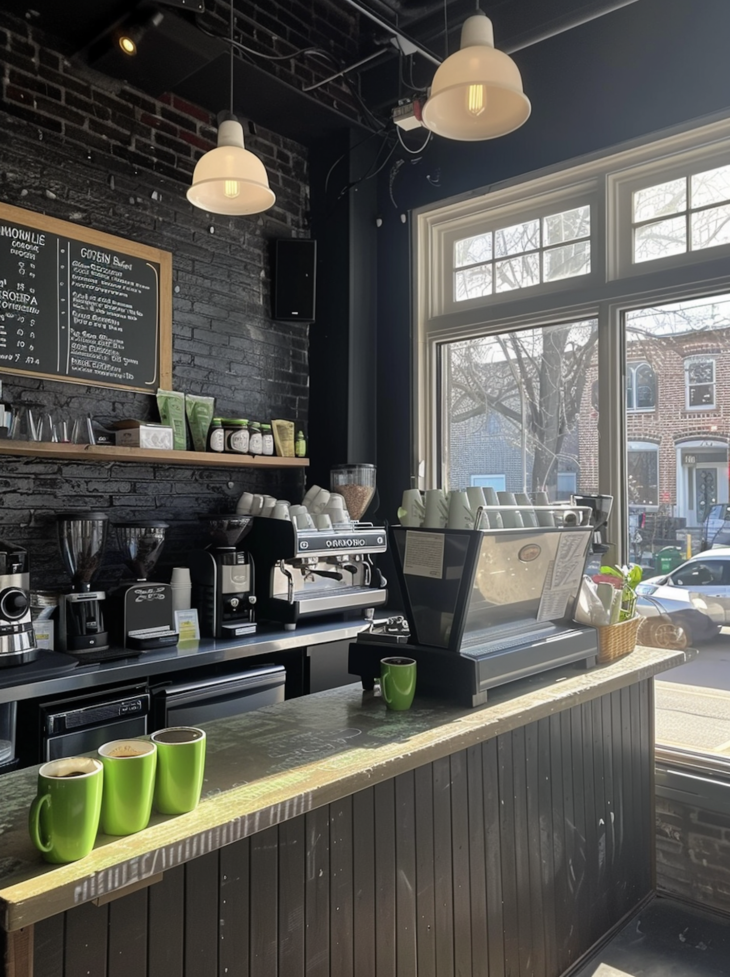 Cozy coffee shop with black brick walls, espresso machine, green mugs, and warm lighting. Large windows reveal a street view.