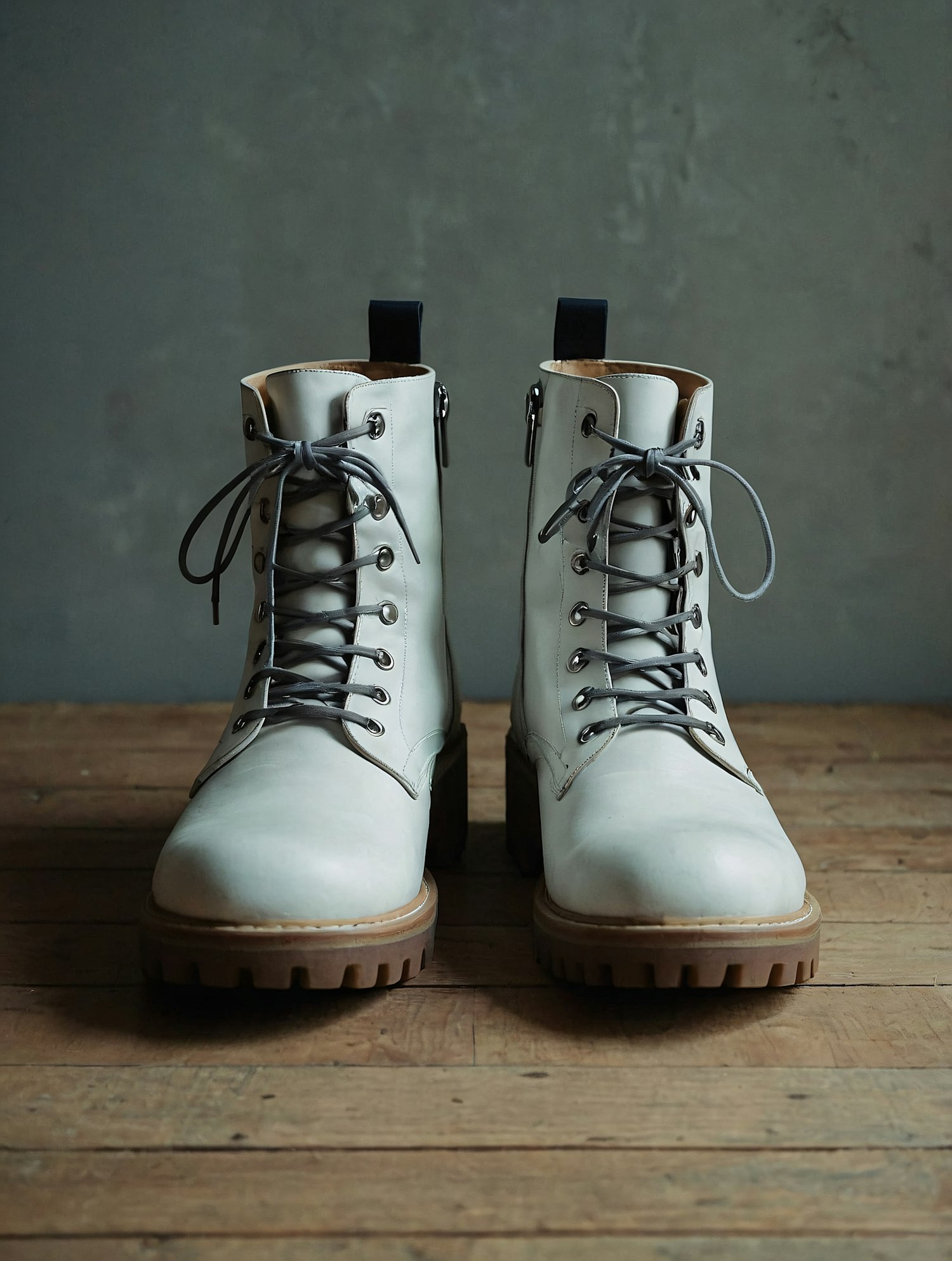 White leather combat boots with tan lug soles and gray laces on a rustic wooden floor, set against a muted gray wall.