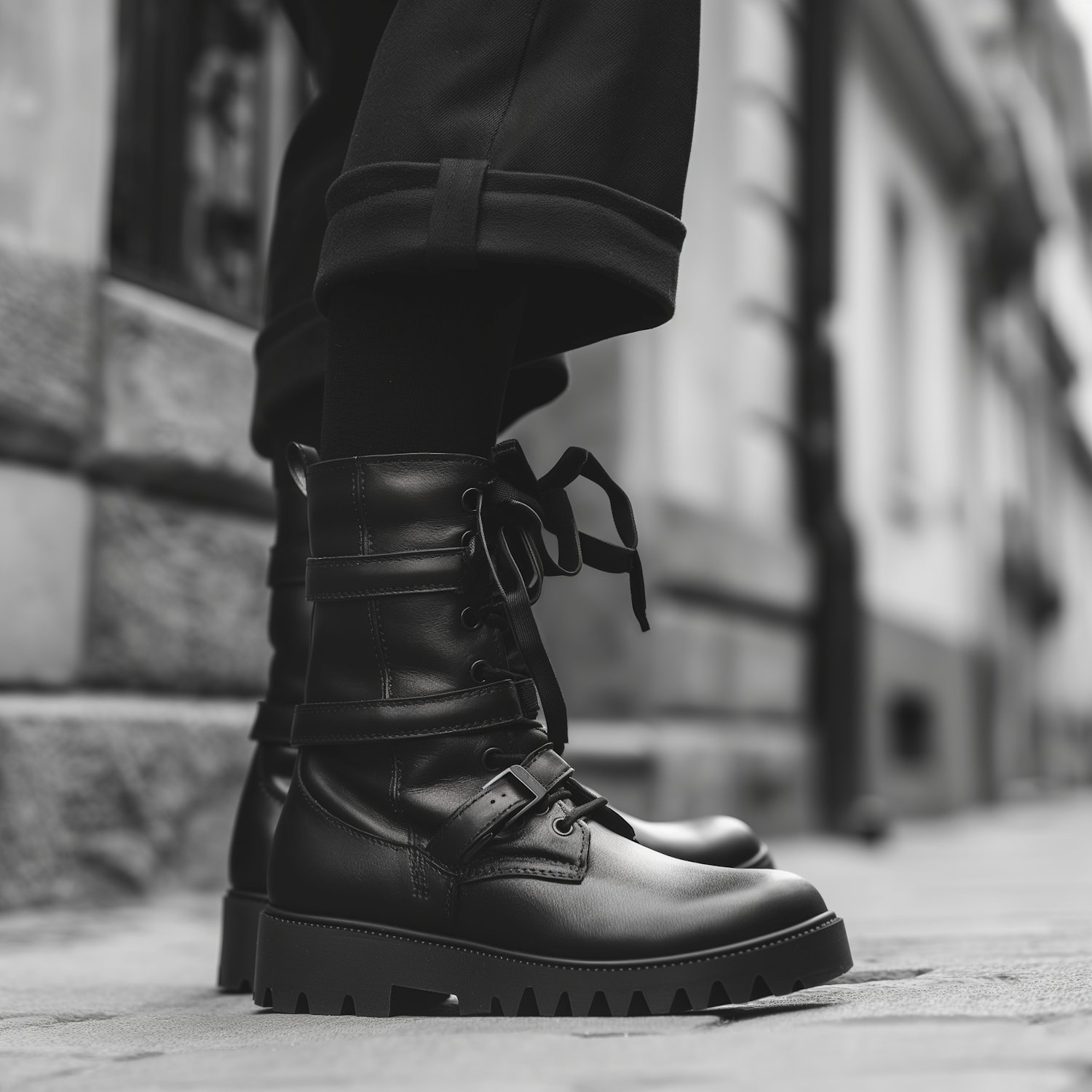Stylish black leather combat boots with rugged soles on a cobblestone street, paired with rolled-up black pants.