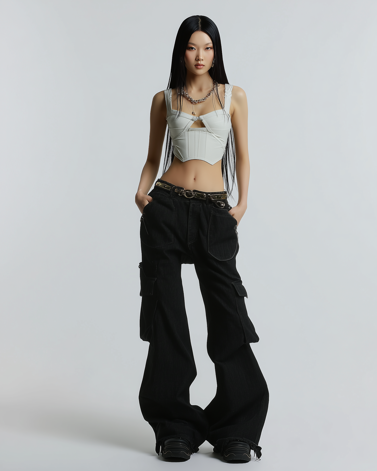 Stylish individual in a white crop top and black cargo pants, accessorized with a chain necklace and belt, standing confidently.