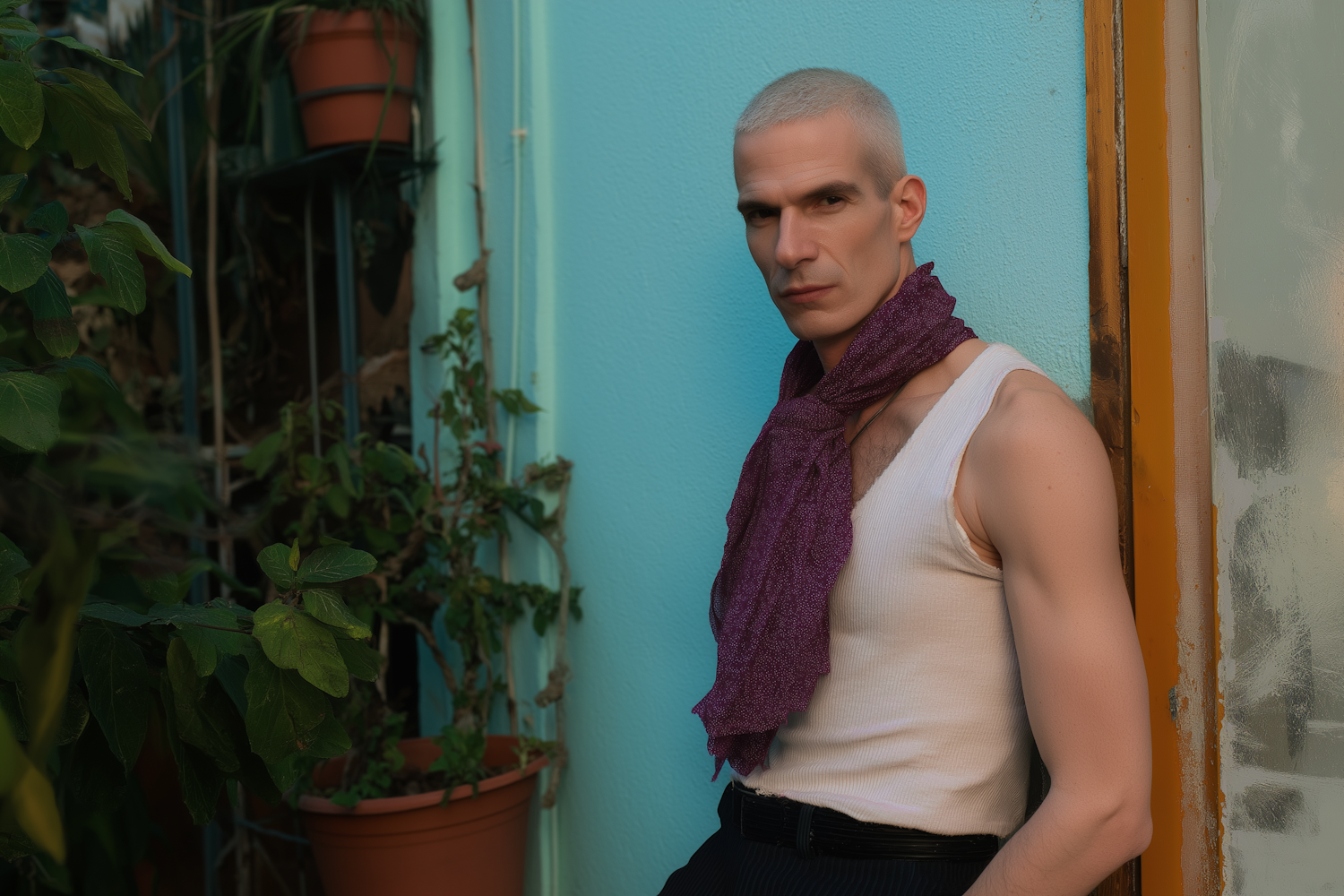 A fashionable, handsome older man with short hair and a purple scarf, posed confidently by a blue wall, complemented by greenery and warm tones.
