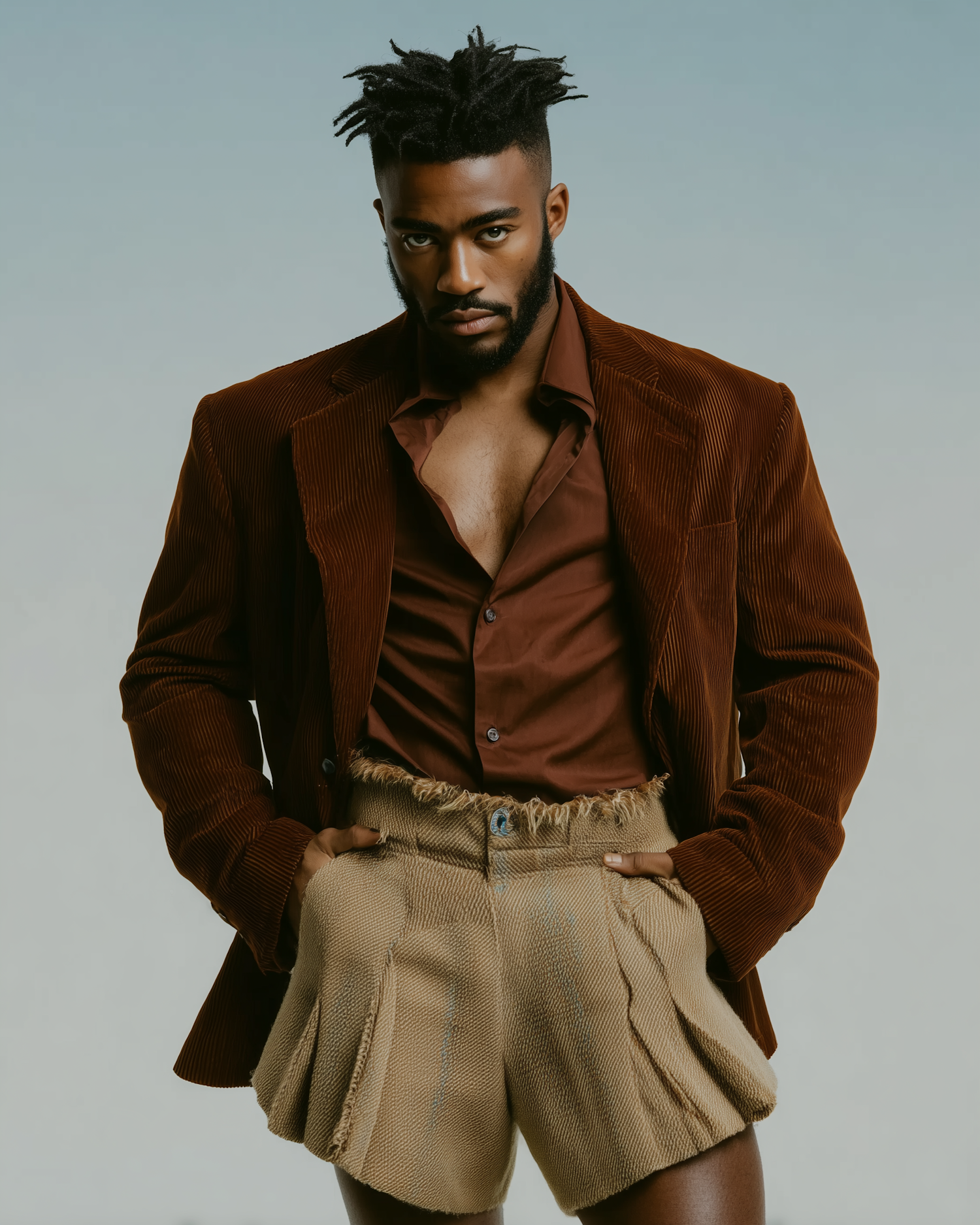 A fashionable person in a brown blazer and beige shorts poses confidently against a neutral gradient background.