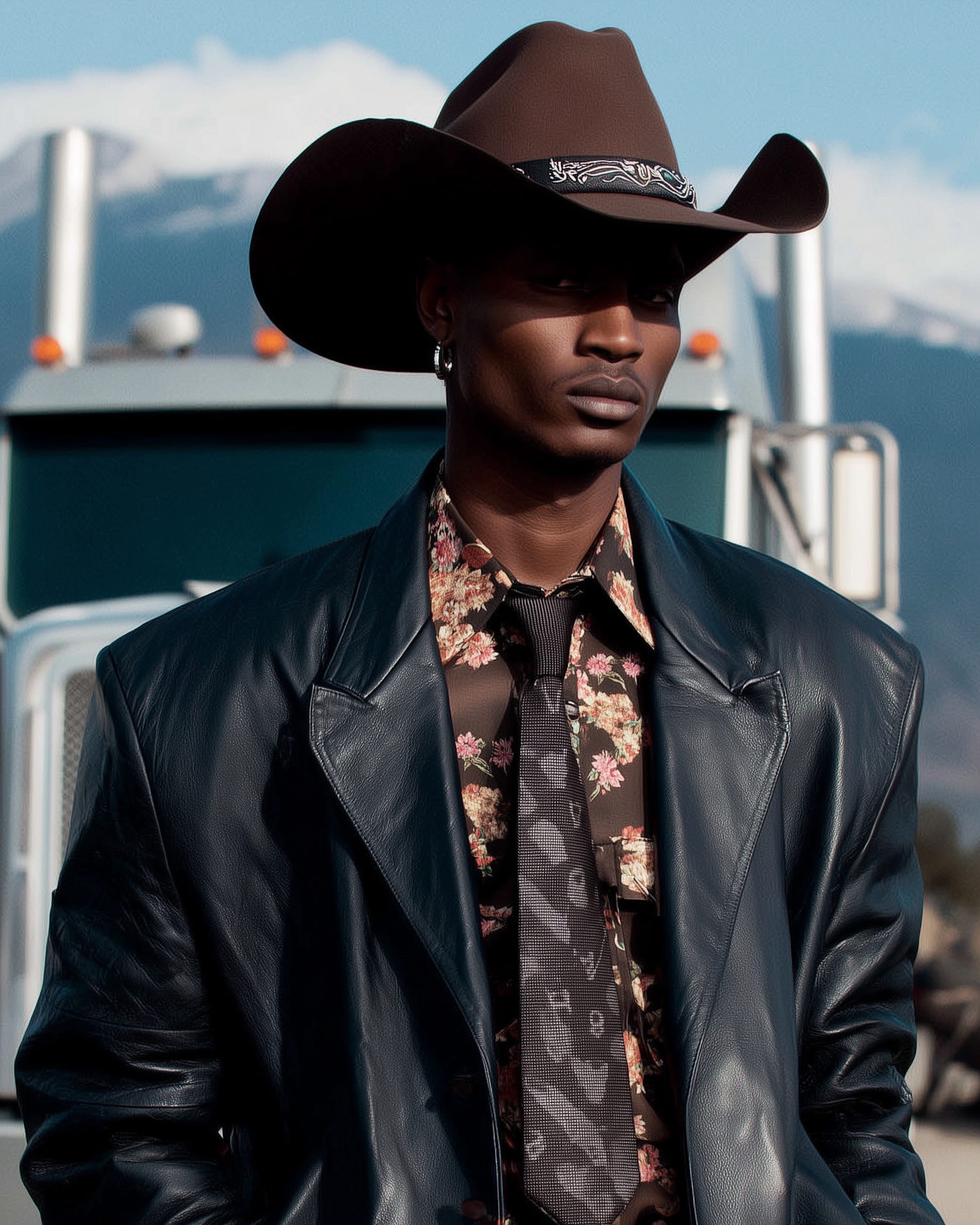 A fashionable person in a cowboy hat and leather jacket stands confidently in front of a truck with a mountain backdrop.