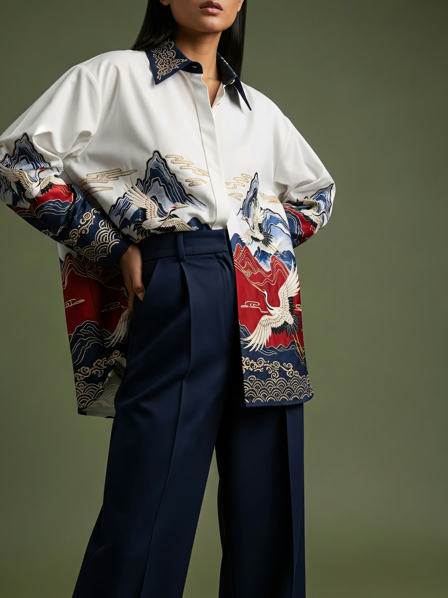 Stylish outfit with a patterned white shirt and navy trousers, blending modern and traditional artistic elements.
