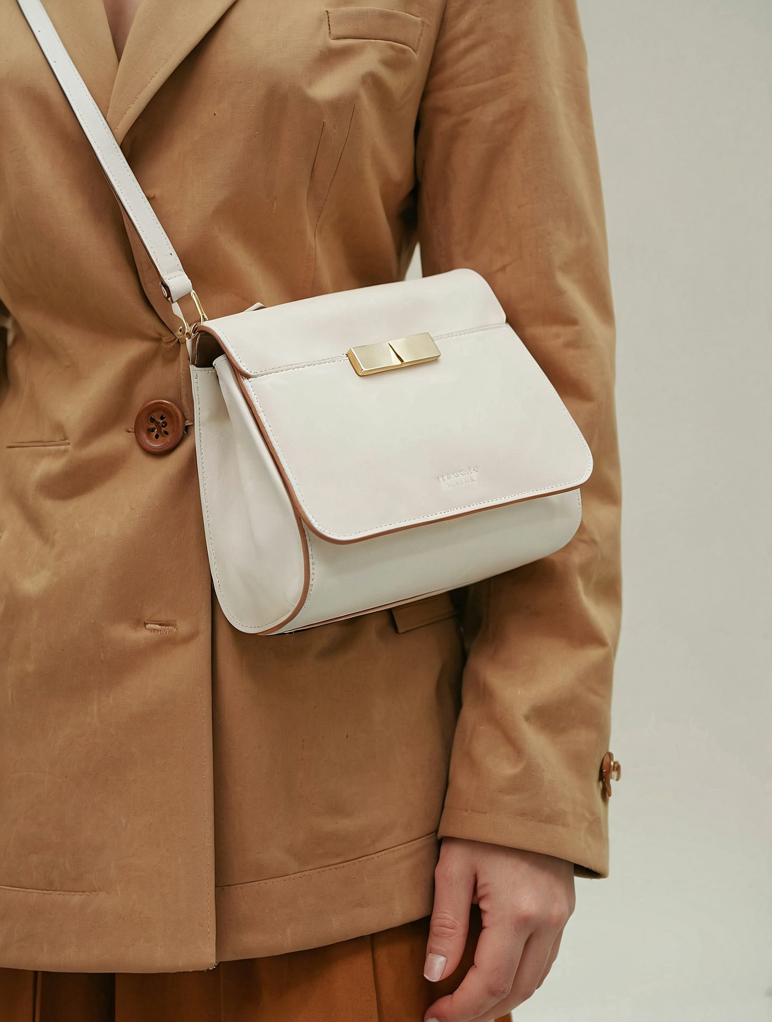 Chic white leather crossbody bag with gold clasp paired with a tan blazer, perfect for a minimalist and elegant look.