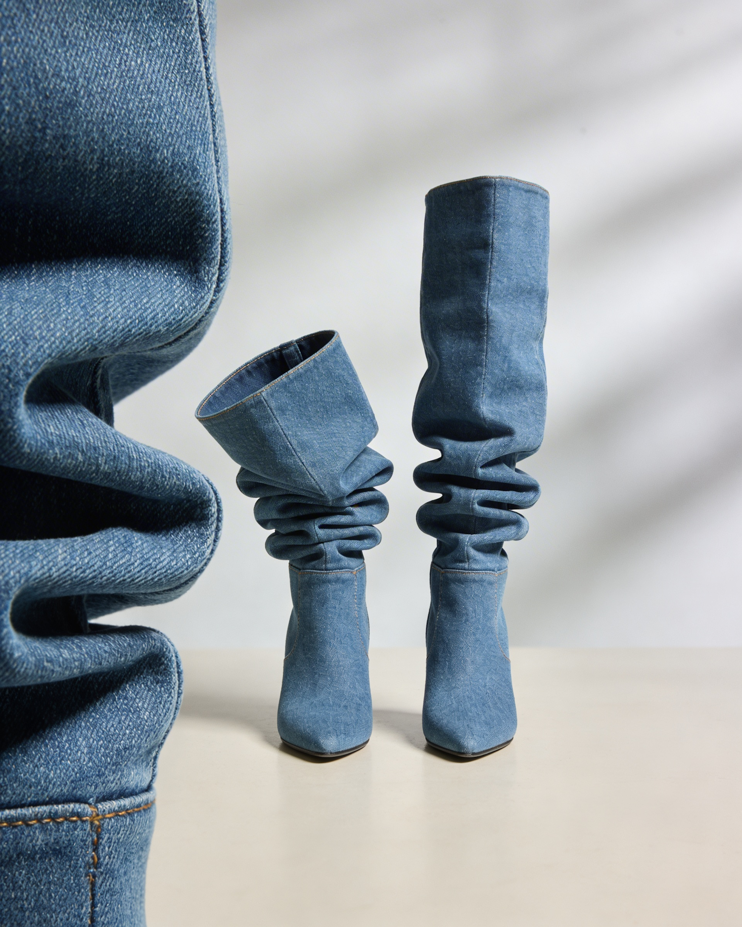 Stylish slouchy denim boots with pointed toes and high heels, displayed on a neutral background with a close-up of the fabric texture.