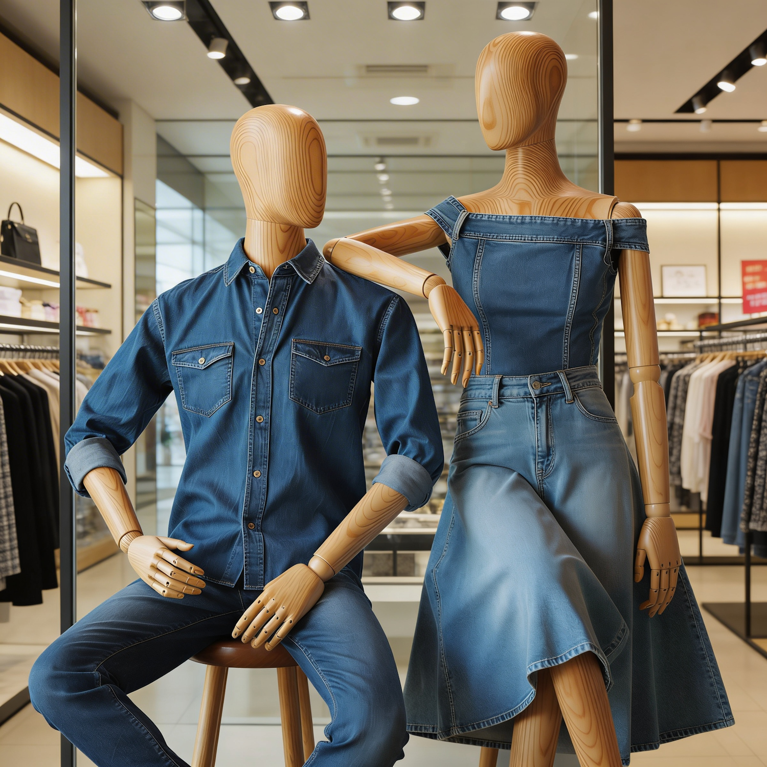Stylish wooden mannequins in a retail store showcase trendy denim outfits, set against a modern clothing store backdrop.