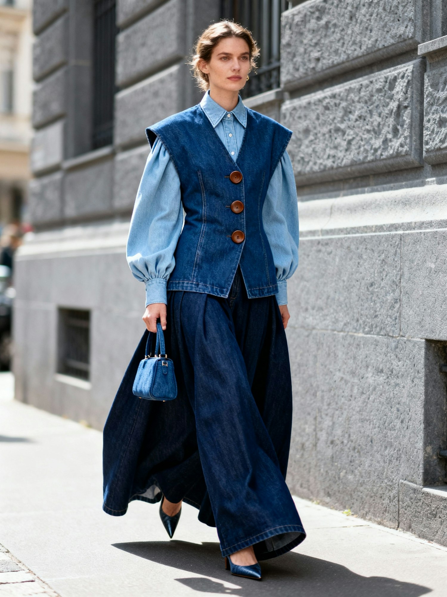 A fashionable woman in a denim outfit walks along a city street, showcasing a stylish vest, wide-leg pants, and a matching handbag.