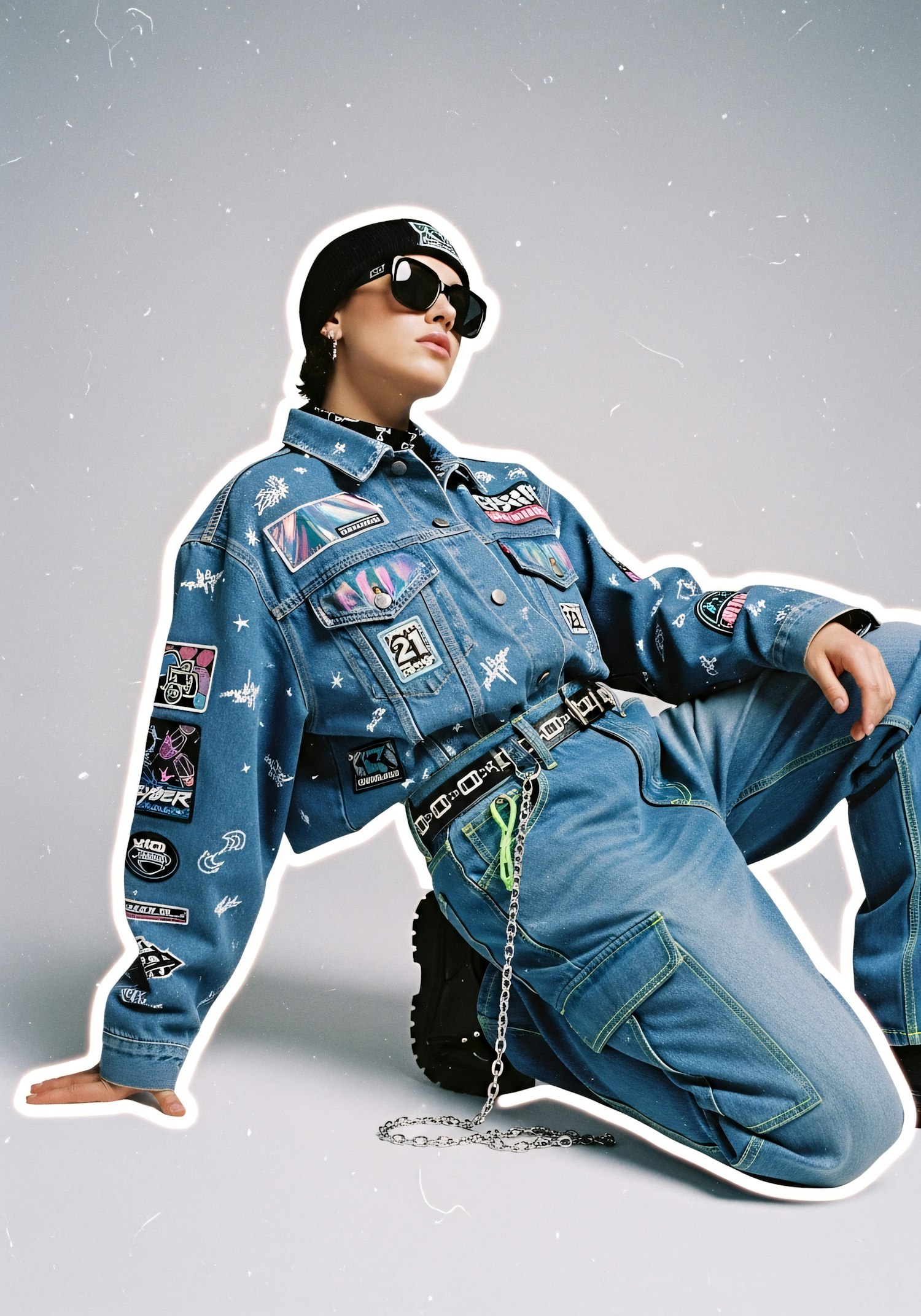 A stylish individual in a denim outfit with patches, accessorized with a beanie, sunglasses, and a chain, set against a minimalistic background.