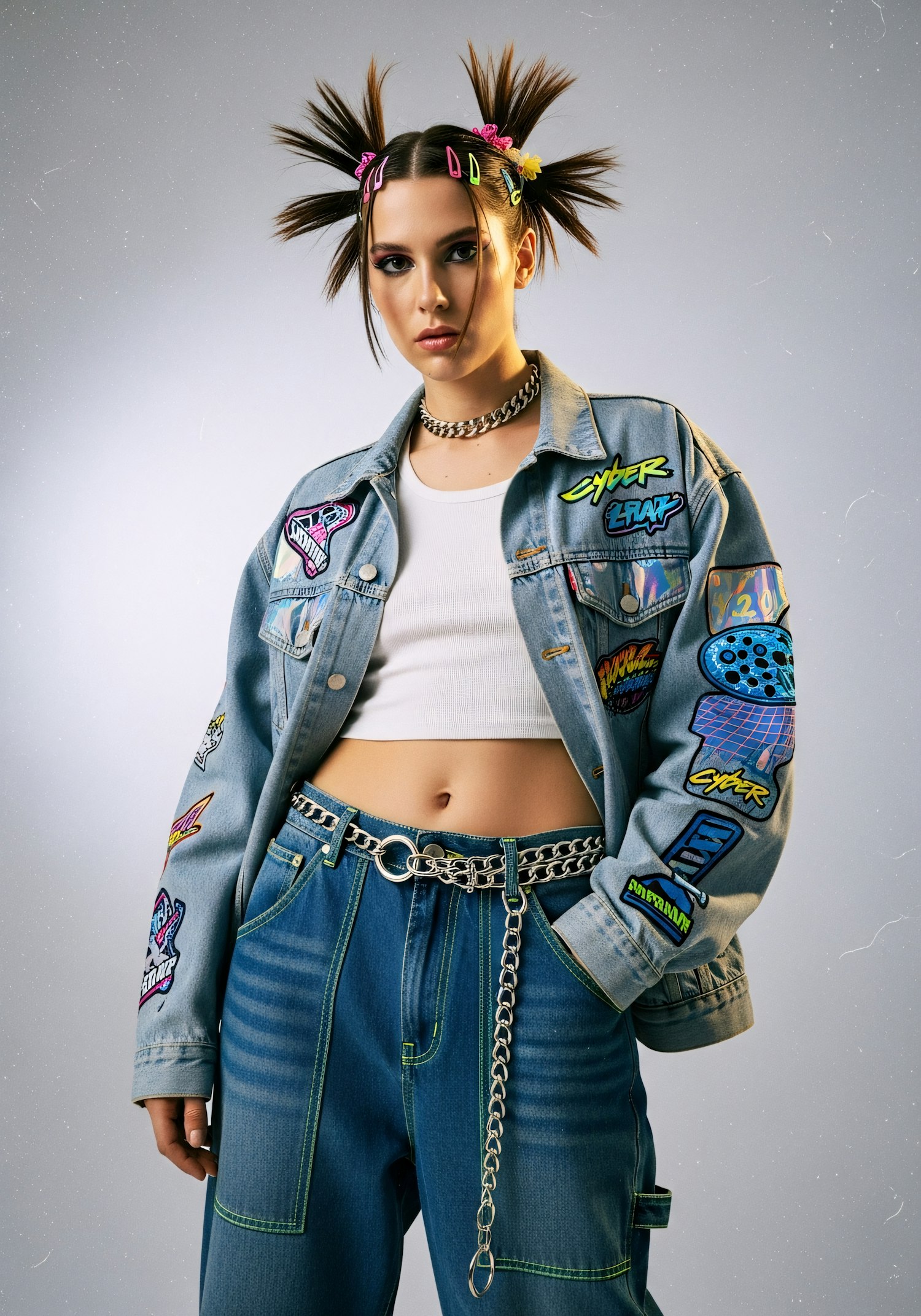 A stylish woman in a denim jacket with colorful patches, unique pigtails, and bold accessories, showcasing a creative and modern look.