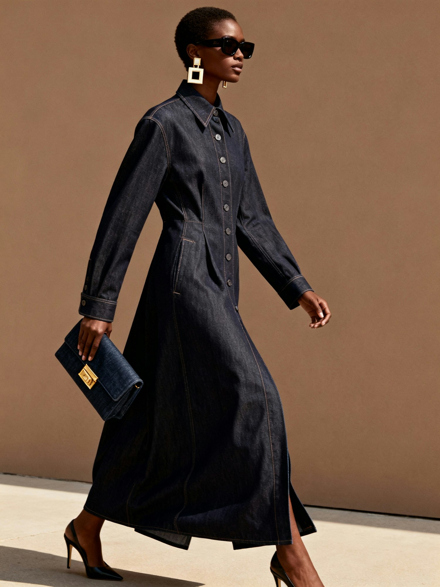 A stylish woman walking confidently in front of a plain background that perfectly matches her warm brown skin tone. She wears a long, flowing dark denim coat-dress with a button-down front and long sleeves, paired with high heels and large square earrings. She carries a matching denim clutch with a gold clasp and wears dark sunglasses. The look is bold and cohesive, blending high-fashion denim with elegant accessories in a street-style setting reimagined with minimalist, skin-toned backdrop