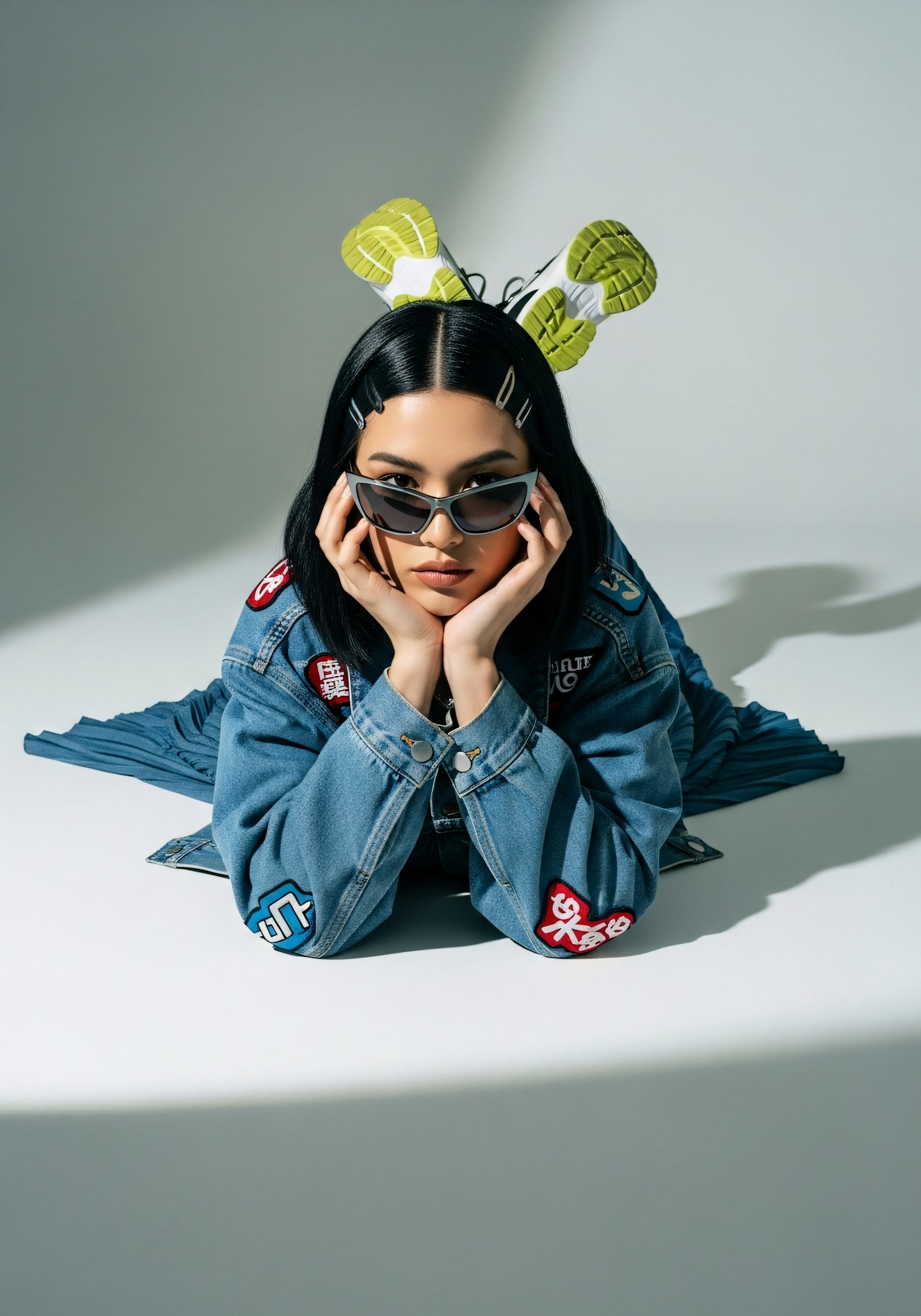 Stylish woman in a denim jacket with patches, wearing sunglasses, lying down with sneakers creatively positioned behind her head.