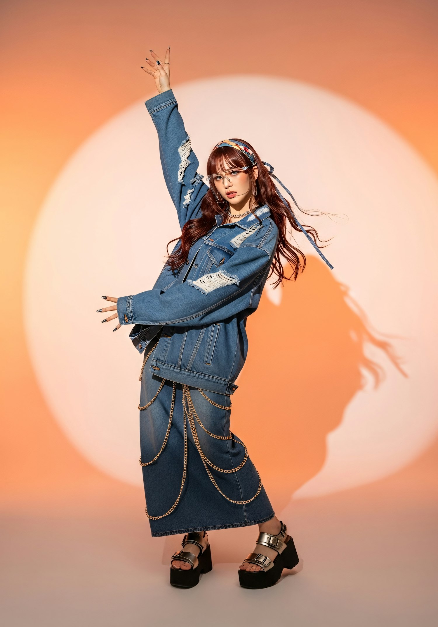 A fashionable person in a denim outfit with gold chains poses against an orange background, showcasing bold style and accessories.