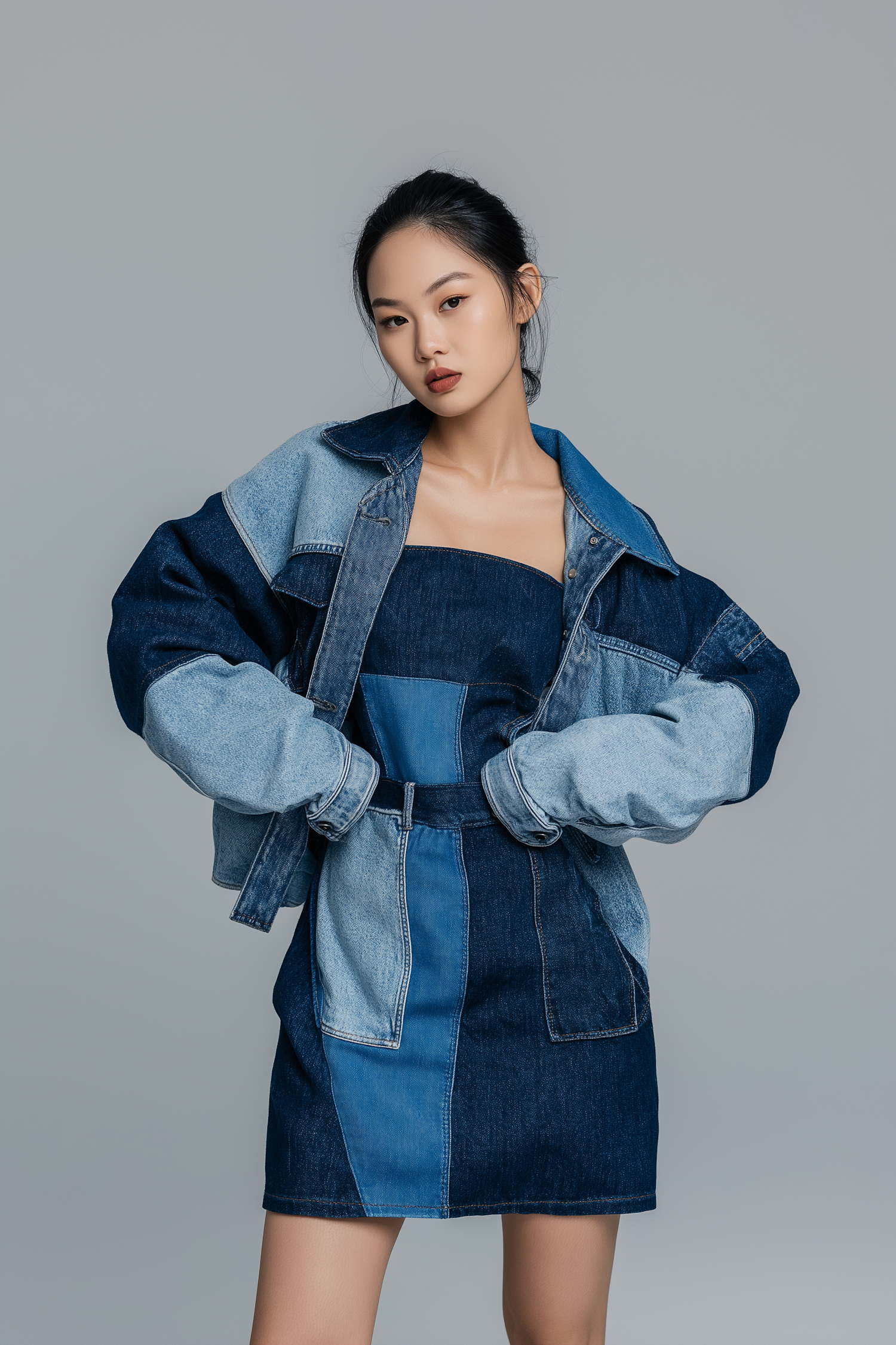 A stylish woman in a patchwork denim outfit poses against a gray background, showcasing modern fashion with a confident expression.