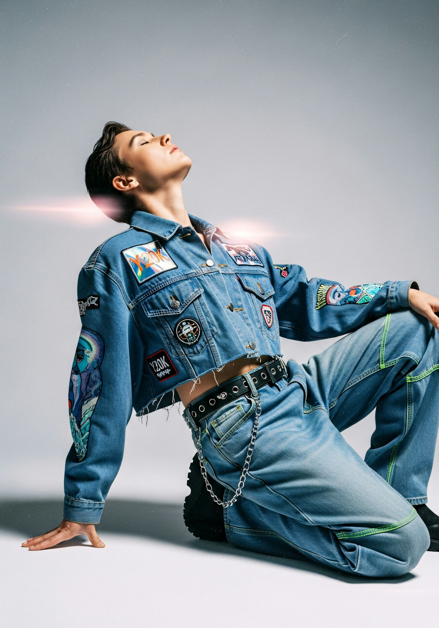 Stylish individual in a denim outfit with colorful patches and neon accents, striking a dynamic pose against a neutral background.