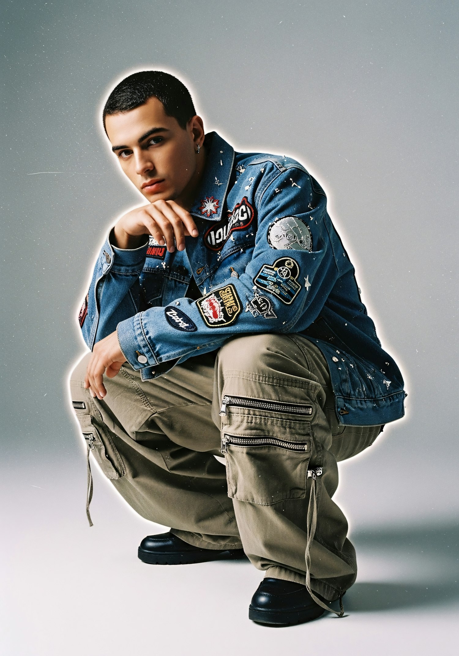 Stylish individual in a patched denim jacket and khaki cargo pants, posing confidently in a studio setting.