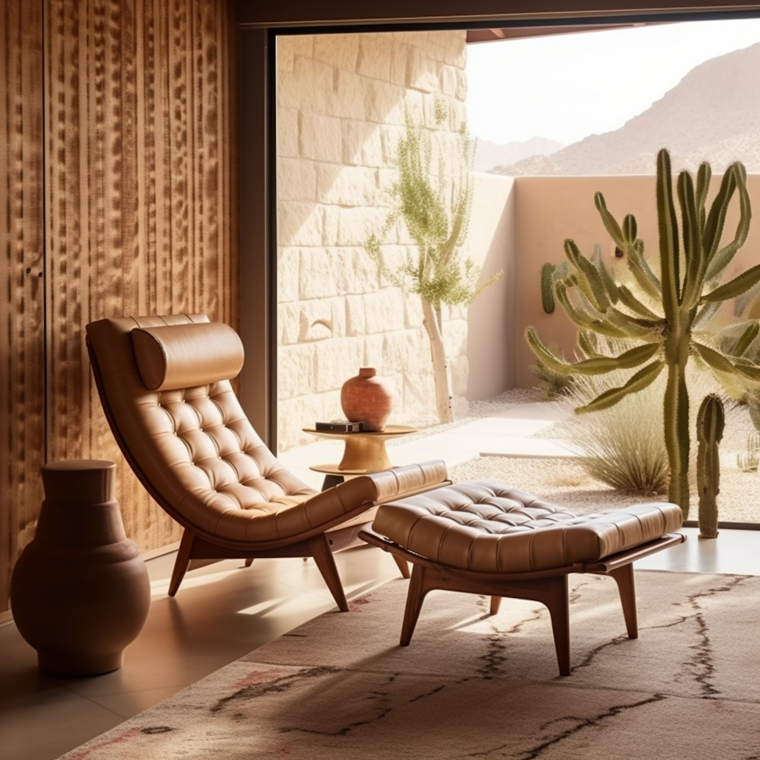 Modern interior with tan leather lounge chair, ottoman, and desert view. Warm tones and minimalist design create a serene atmosphere.