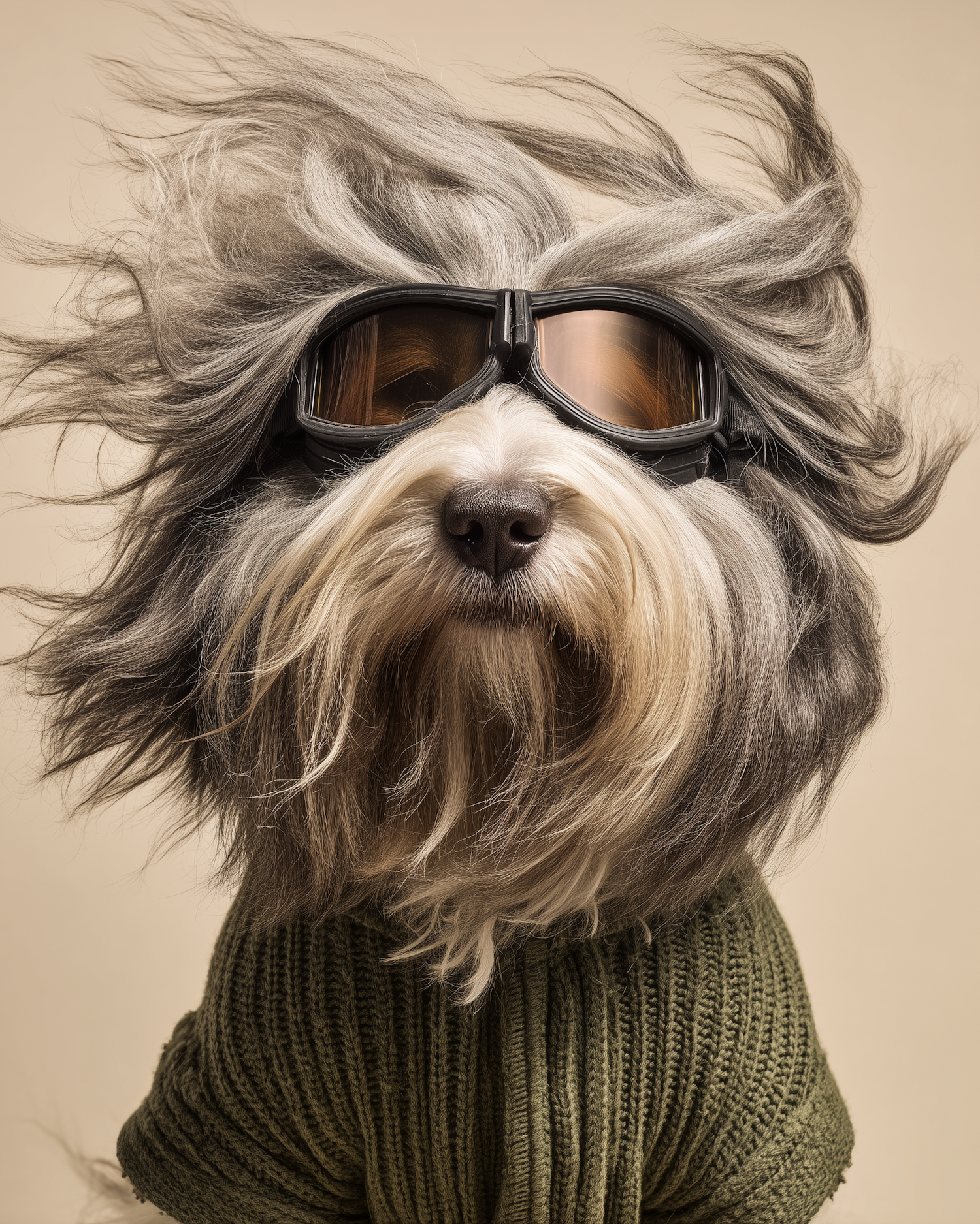 Adorable dog with windswept gray fur, black goggles, and a green sweater, posing against a beige background. Stylish and fun vibe!