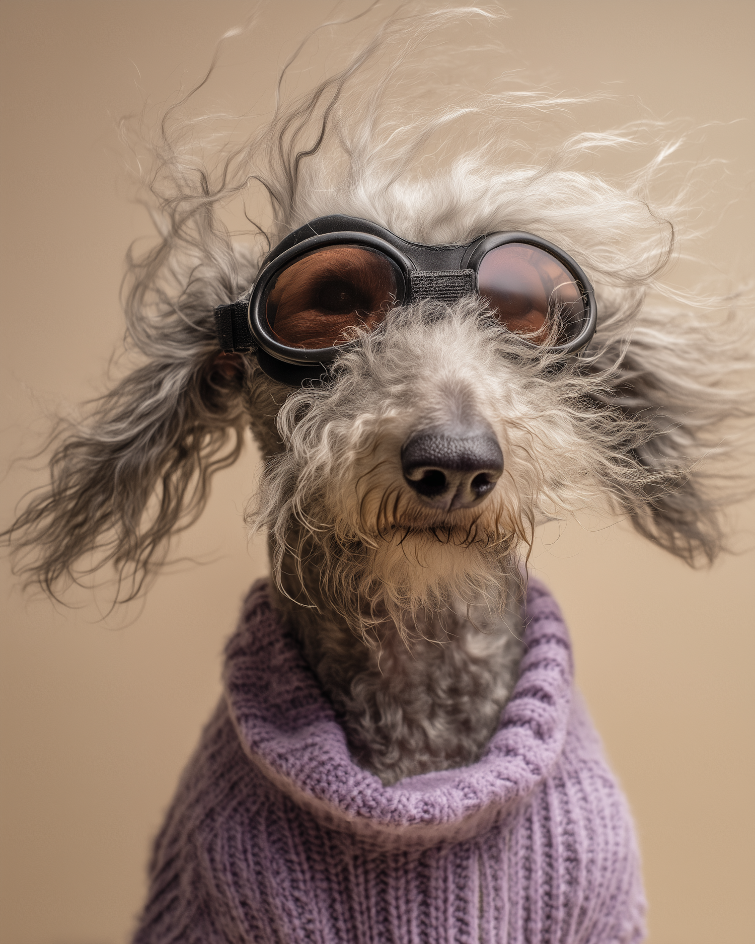 Adorable gray dog in a lavender sweater and goggles, looking adventurous with windswept fur against a soft beige background.