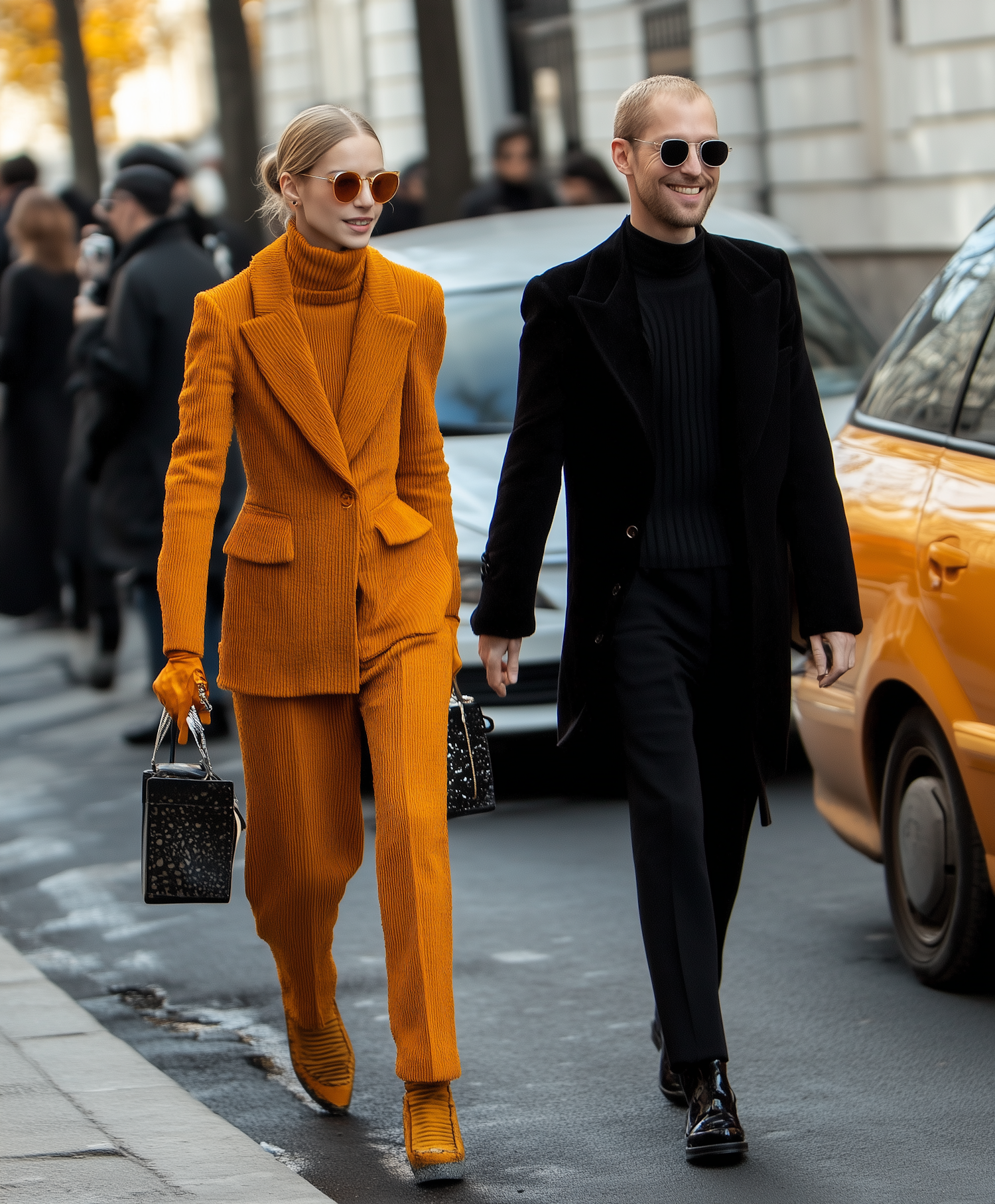 Fashionable couple in vibrant orange and black outfits walking confidently on a city street, exuding style and elegance.