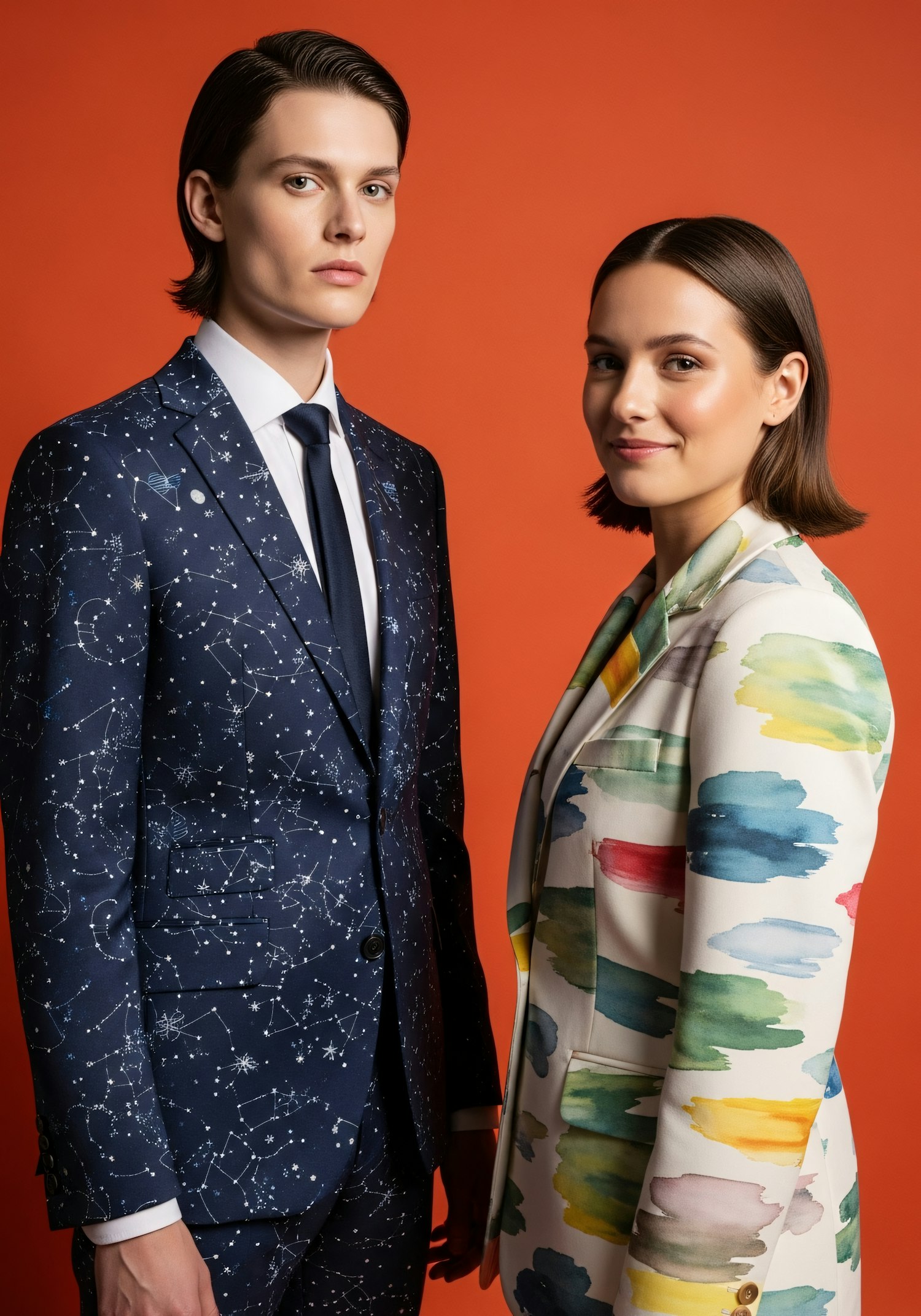 A man in a constellation-patterned suit and a woman in a colorful blazer pose against an orange background, showcasing unique fashion.