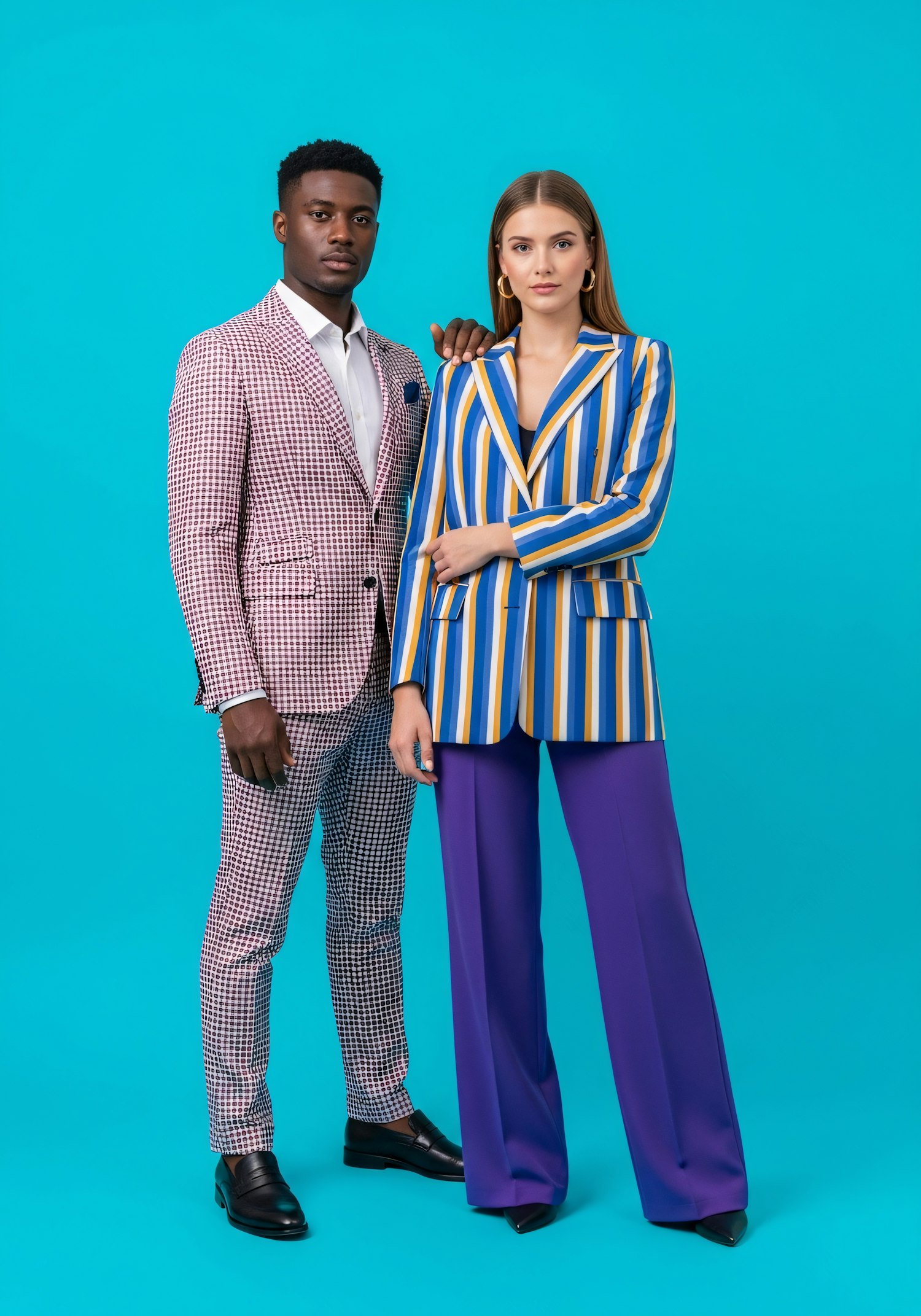 A stylish man and woman in bold patterned outfits pose against a turquoise background, showcasing modern fashion and vibrant colors.