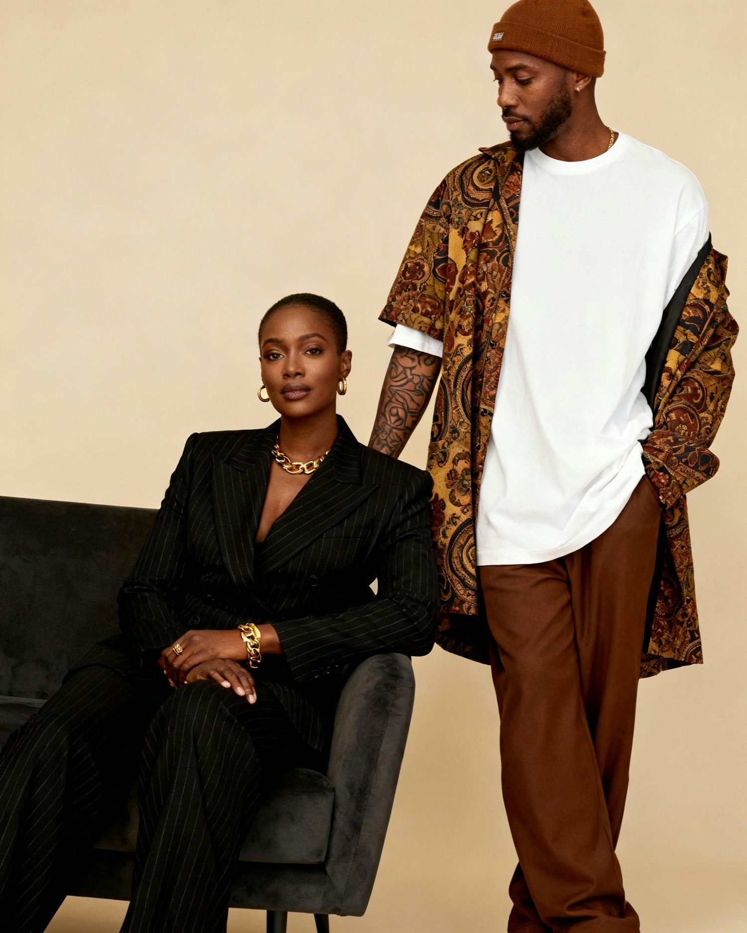 Ultra-high-definition portrait featuring two stylish Black individuals posed in a fashion-forward editorial scene. On the left, a woman sits elegantly on a dark sofa, wearing a black pinstripe suit adorned with gold accessories. Her posture is composed and confident, exuding quiet power and modern elegance. Beside her stands a man in a white oversized T-shirt layered under a patterned jacket with rich earth-toned motifs, paired with relaxed brown pants and a brown beanie. One arm is slightly raised, revealing a detailed tattoo sleeve. The soft beige background enhances the warmth of their outfits and skin tones, while soft directional lighting casts sculptural highlights across their garments and expressions. The overall mood is editorially sharp, culturally rich, and emotionally resonant—ideal for an Afro-fusion fashion portrait or identity-focused visual narrative.
