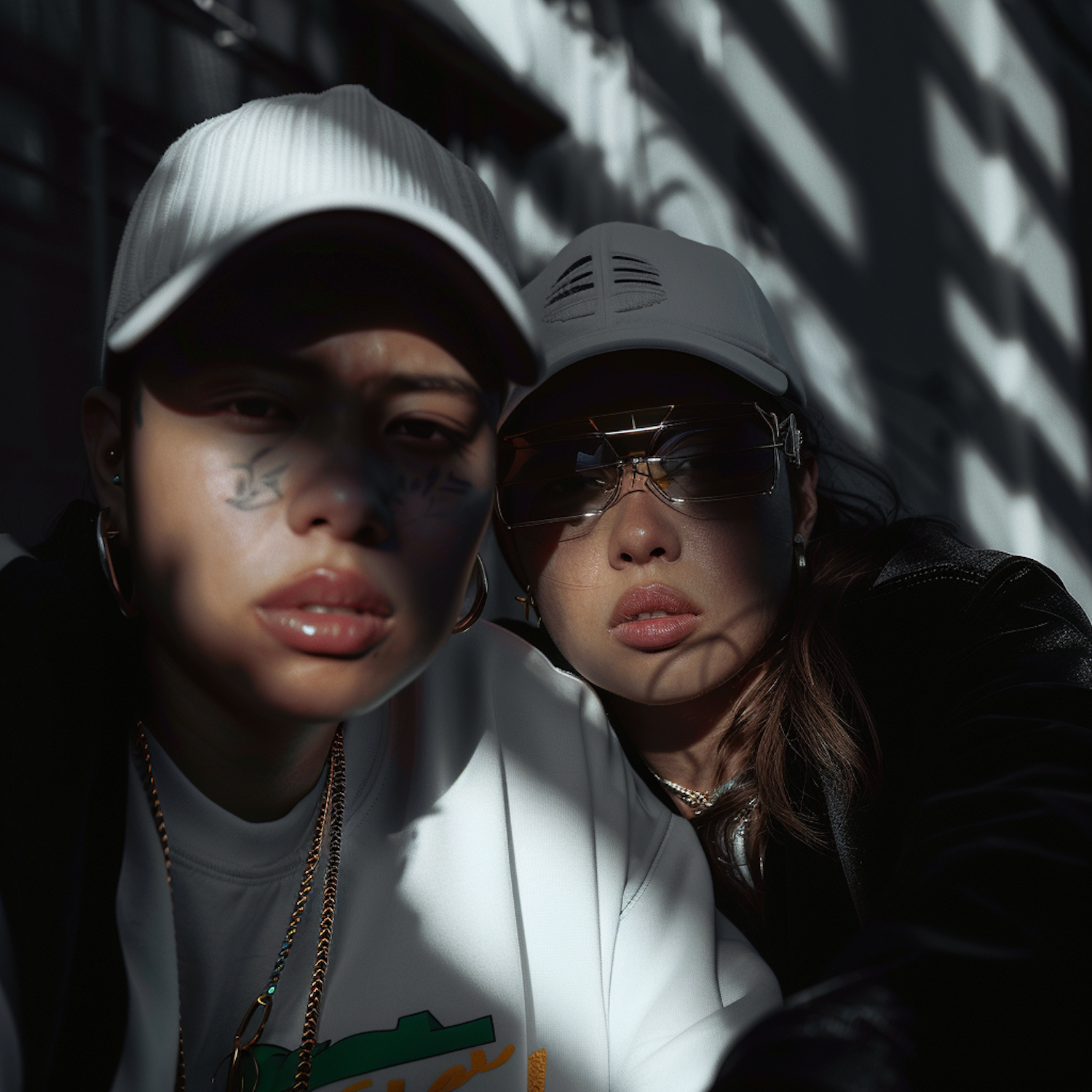 Two stylish individuals in caps and accessories, captured in dramatic lighting with shadows adding depth to their expressions.