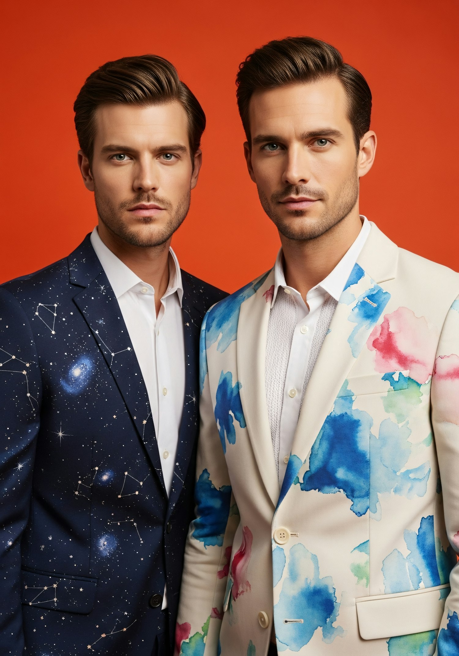Two men in artistic suits, one with a galaxy design and the other with watercolor patterns, pose against a vibrant orange background.