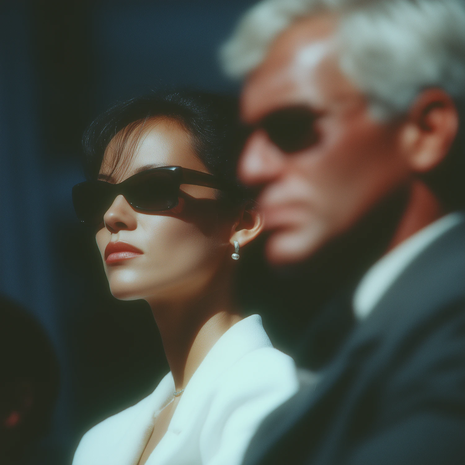 A stylish close-up of a woman in white and a man in a suit, both wearing sunglasses, with dramatic lighting and a sophisticated vibe.