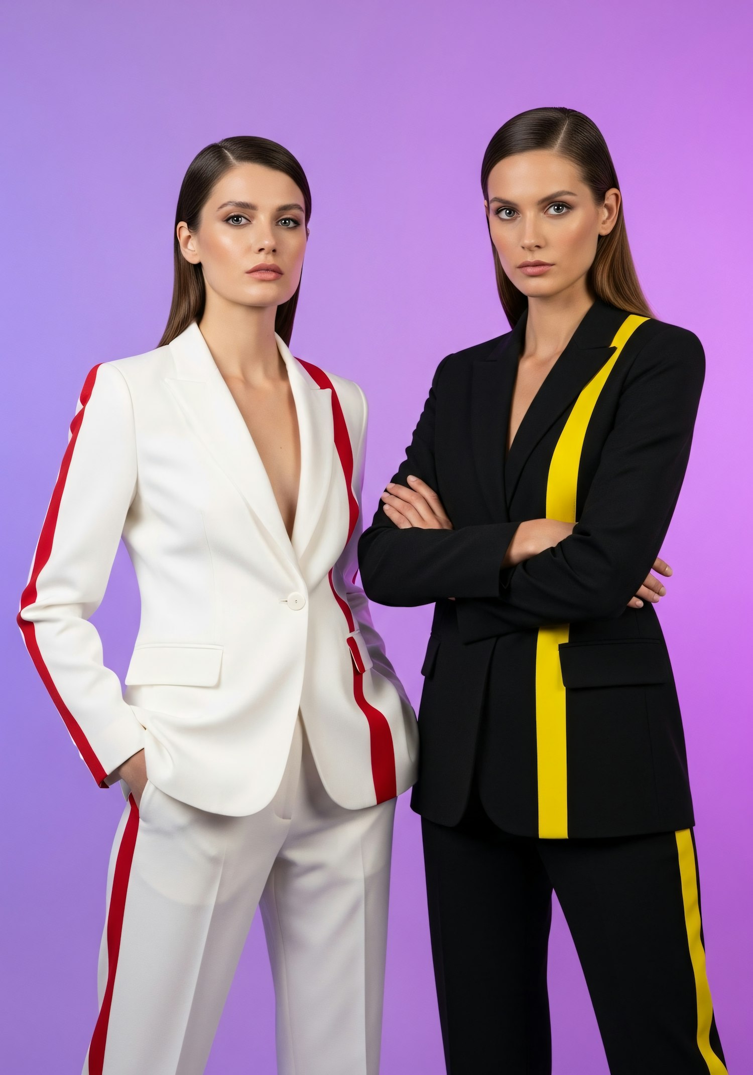 Two individuals in stylish suits with bold red and yellow accents pose confidently against a vibrant purple background.