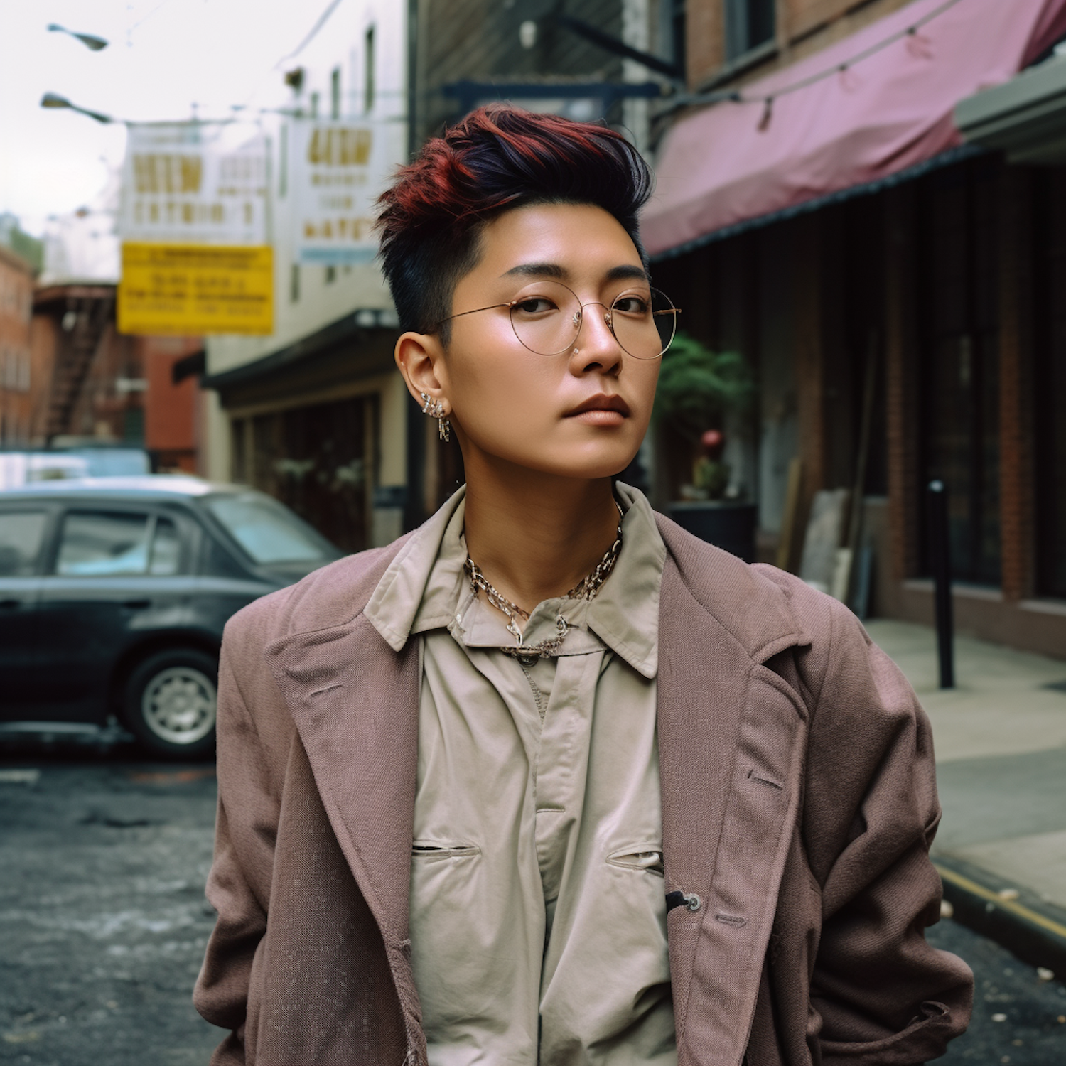 Stylish individual with red-highlighted hair and silver accessories in an urban setting, wearing a beige shirt and mauve blazer.