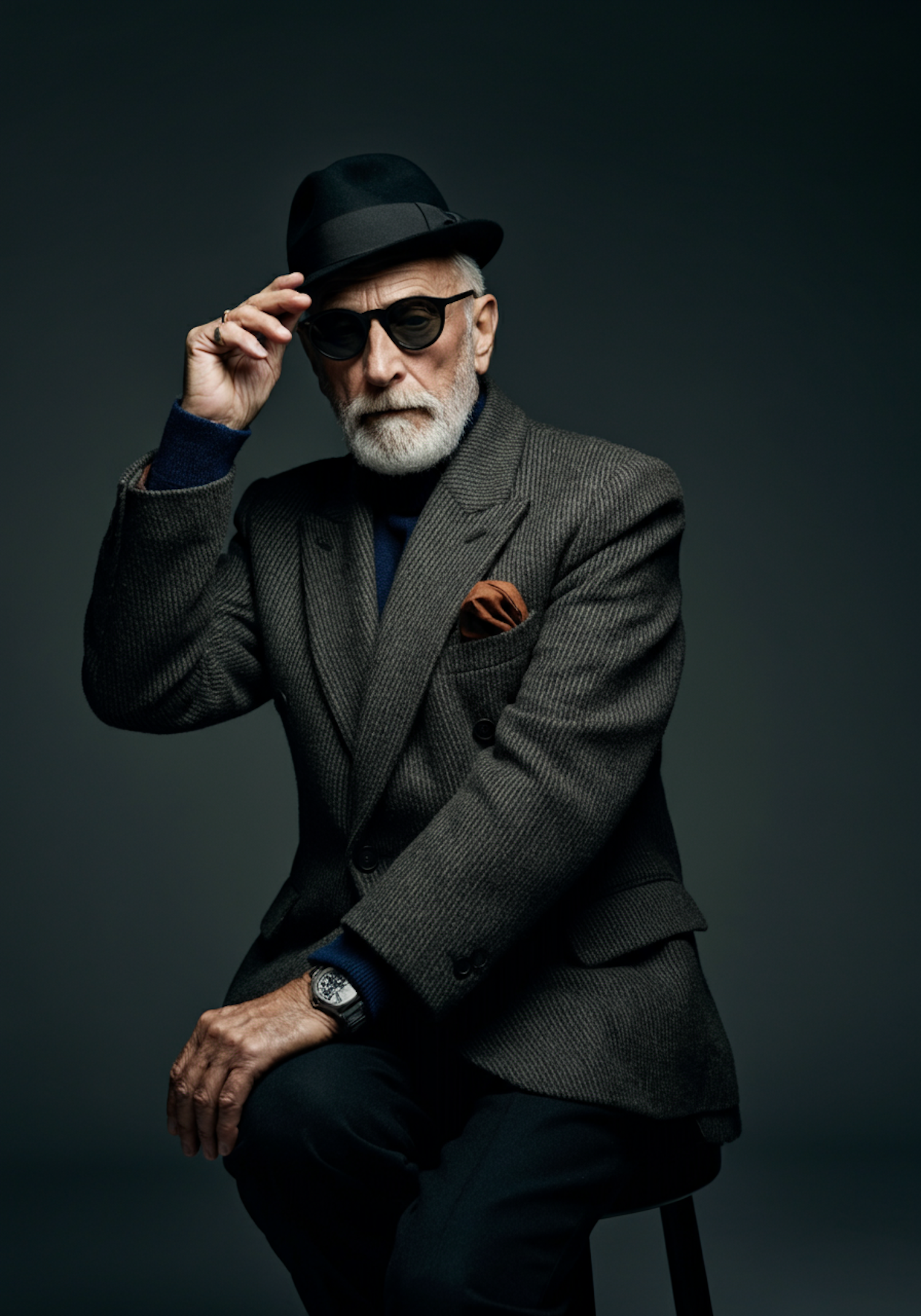 Stylish elderly man in a suit and fedora, adjusting his hat with confidence. Dark sunglasses and a brown pocket square add flair.
