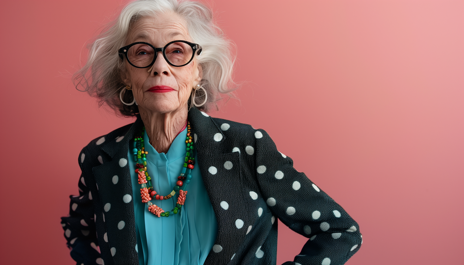 Stylish elderly woman with white hair, bold glasses, and colorful accessories against a pink background, exuding confidence and elegance.