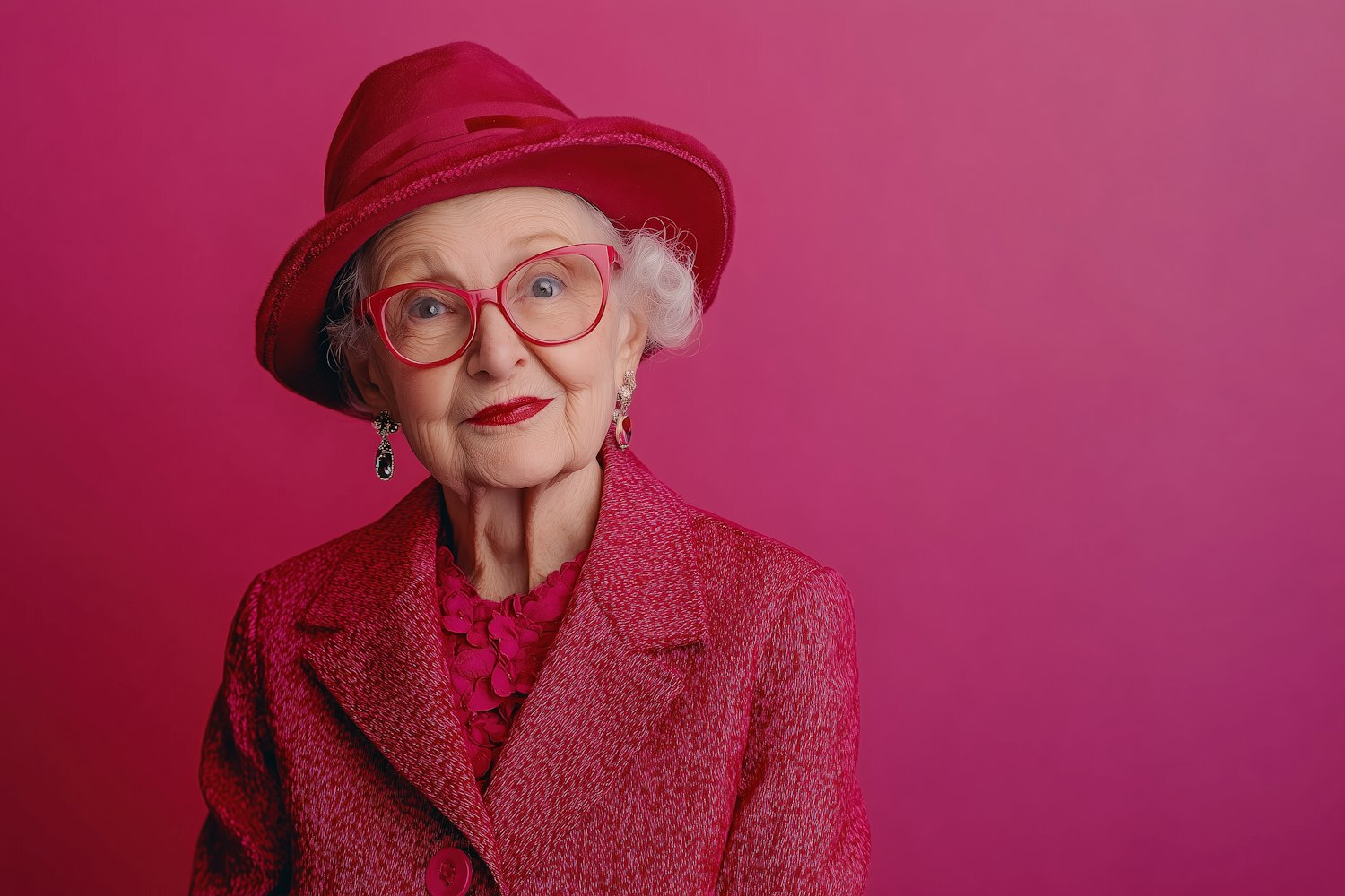 Stylish elderly woman in a magenta outfit with matching hat and glasses, set against a bold magenta background.